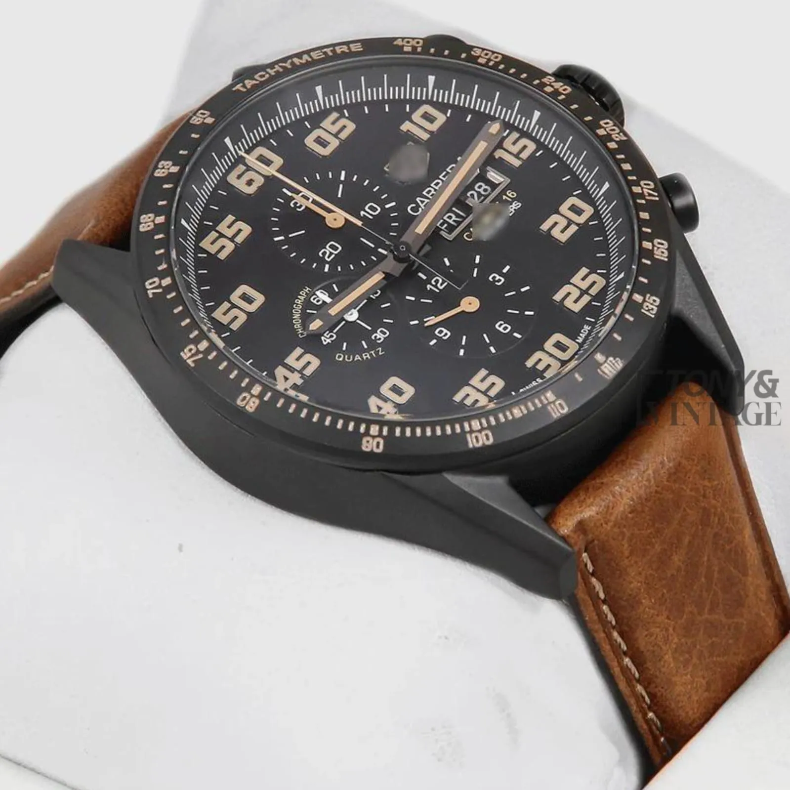 Black Chronograph Watch with Brown Leather Strap and Matching Dial