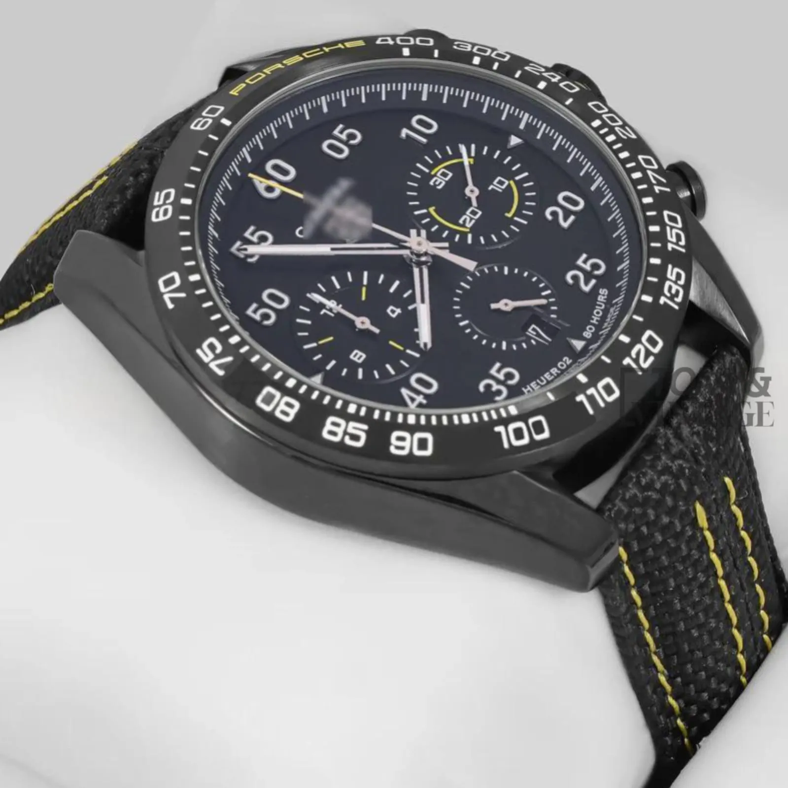“Chronograph All-Black Case Watch with Dial and Black Leather Strap “