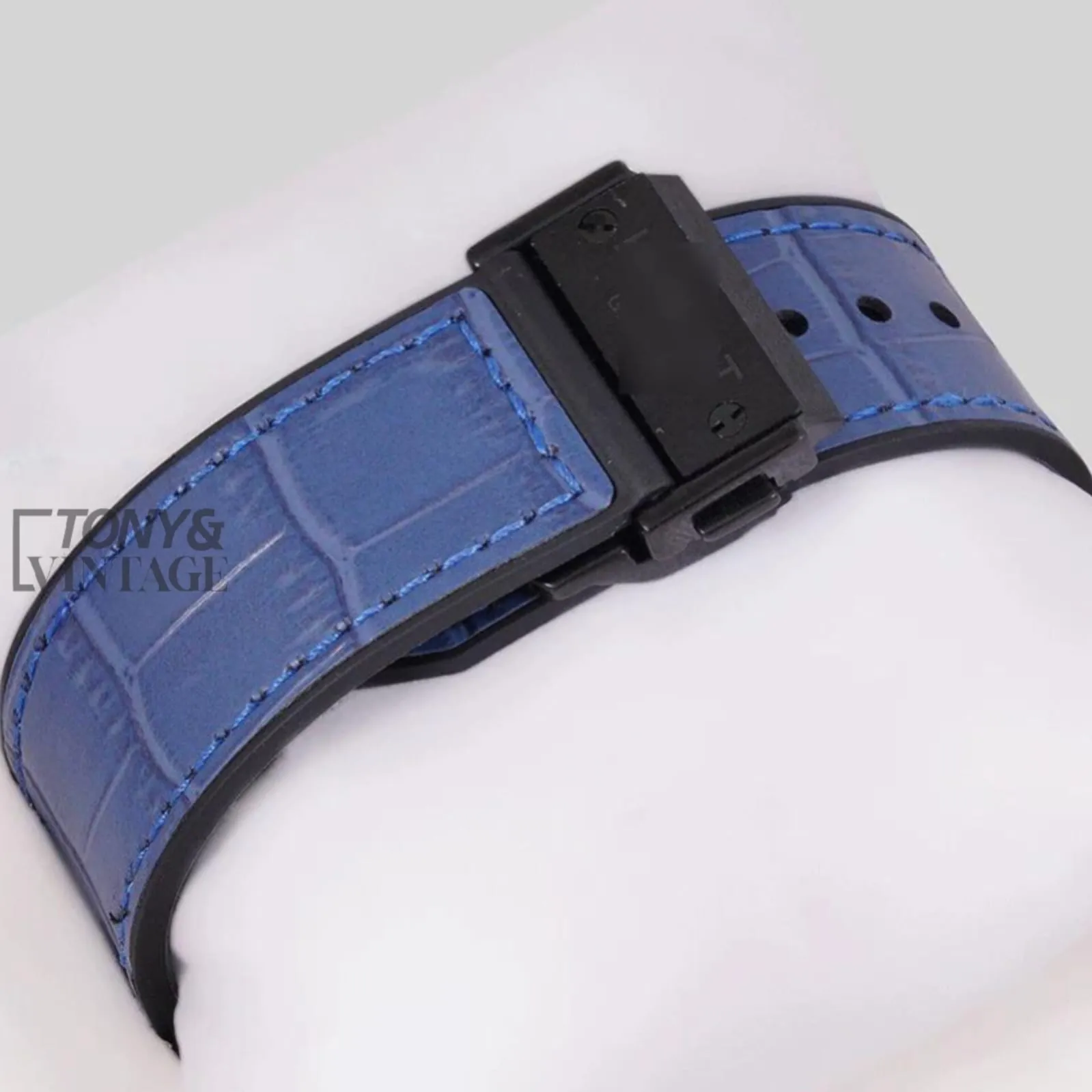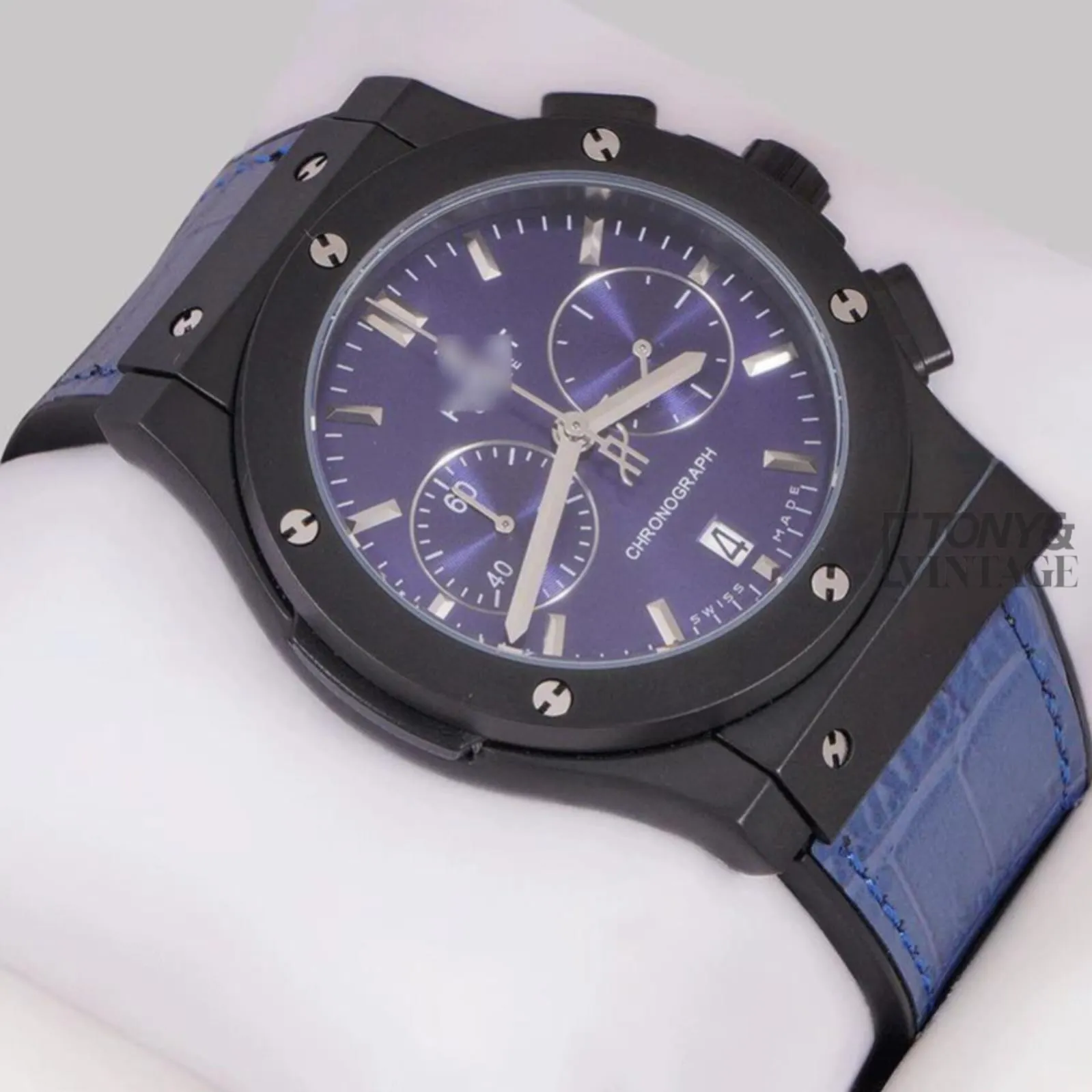 Chronograph Black Watch With Blue Dial and Blue Leather Strap