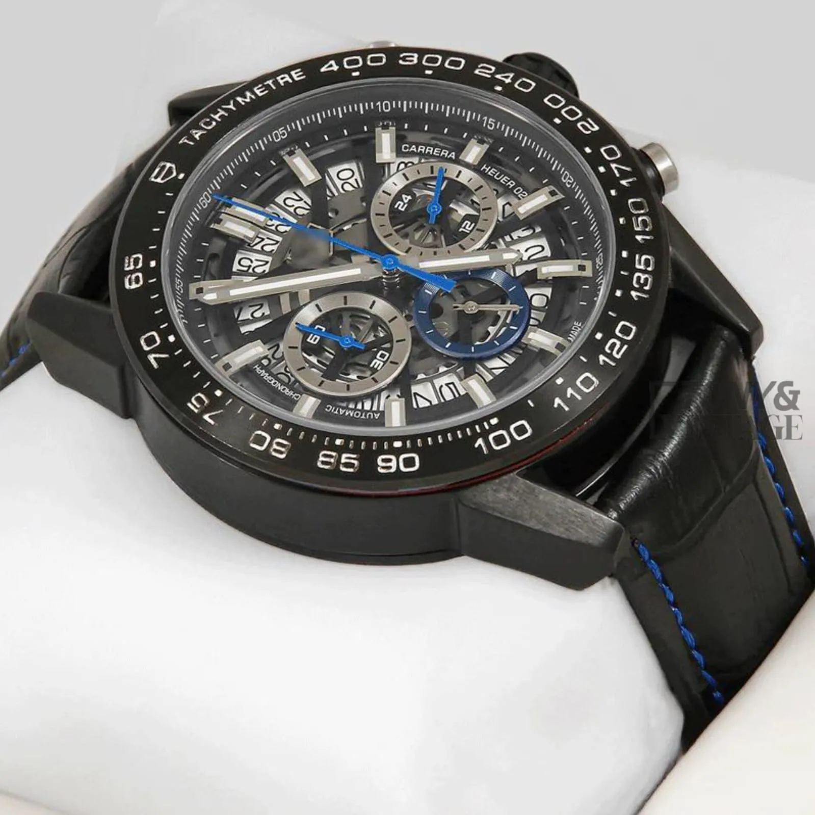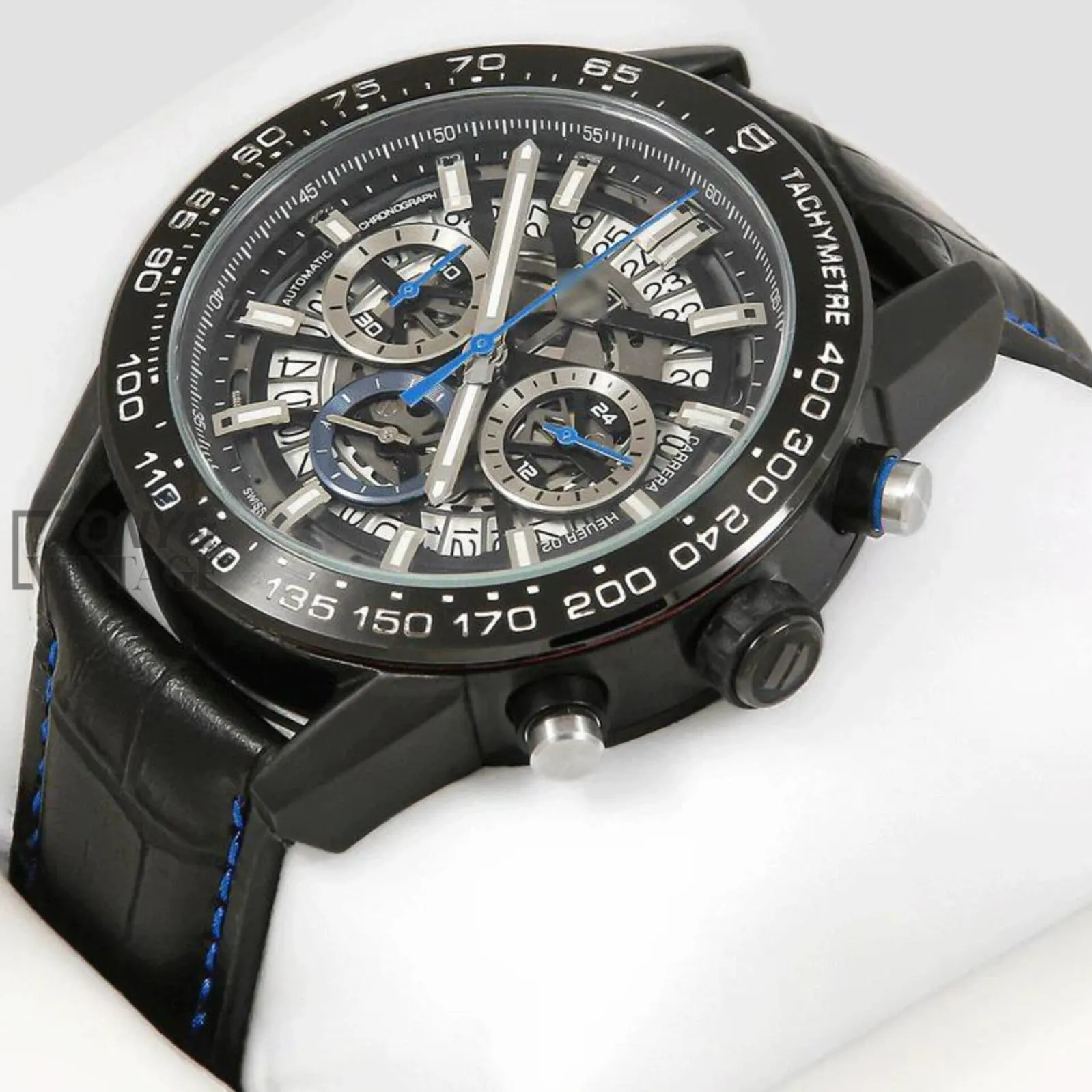 “Chronograph Black Watch with Skeleton Dial and Leather Strap “