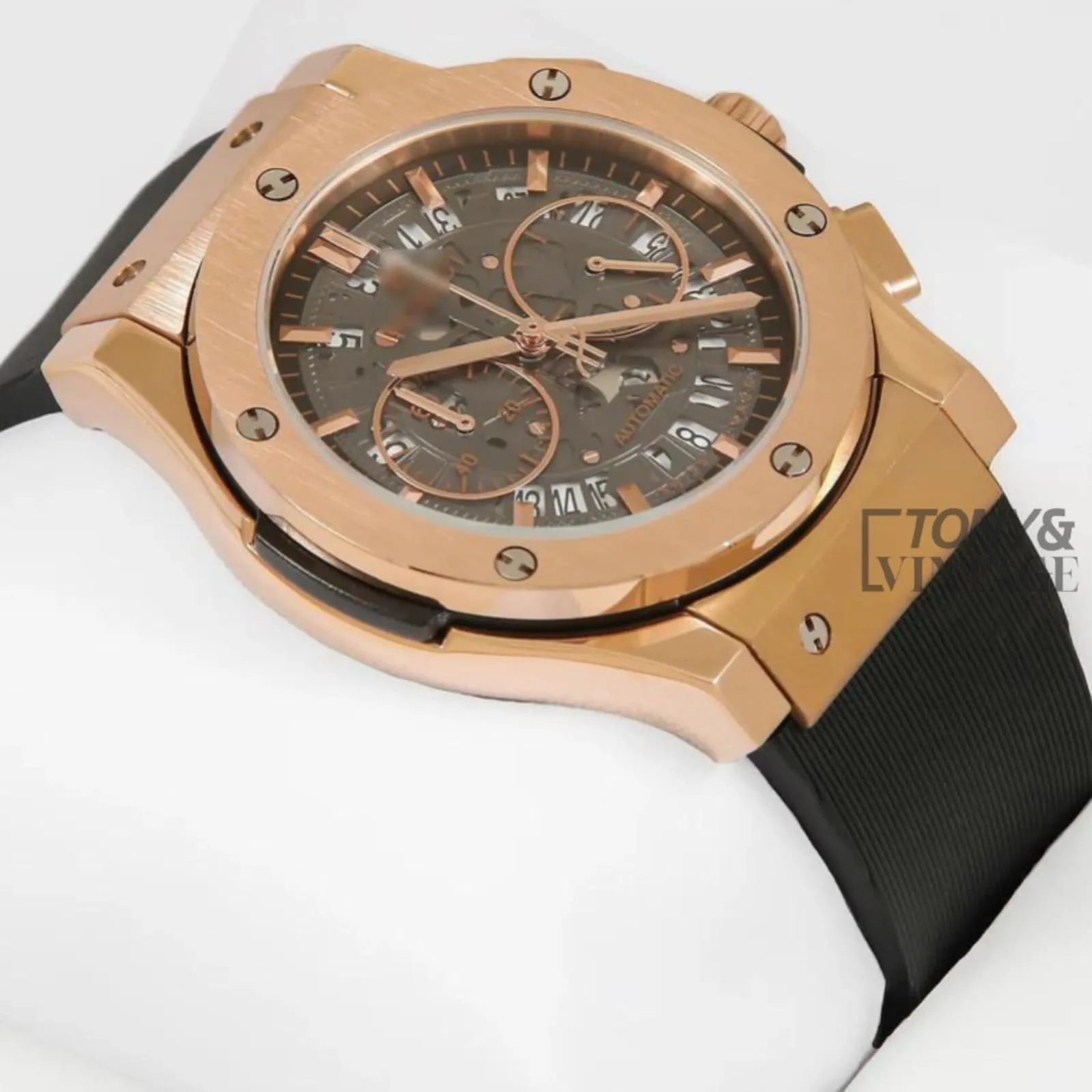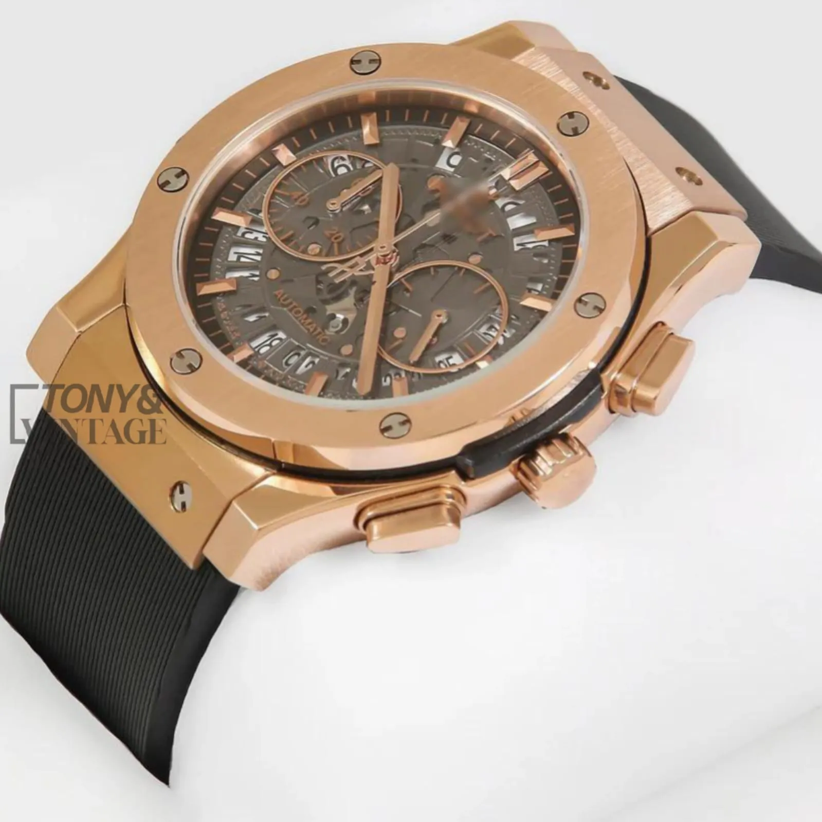 Chronograph Rose Gold Case With Brown Skeleton Dial & Black Rubber Strap