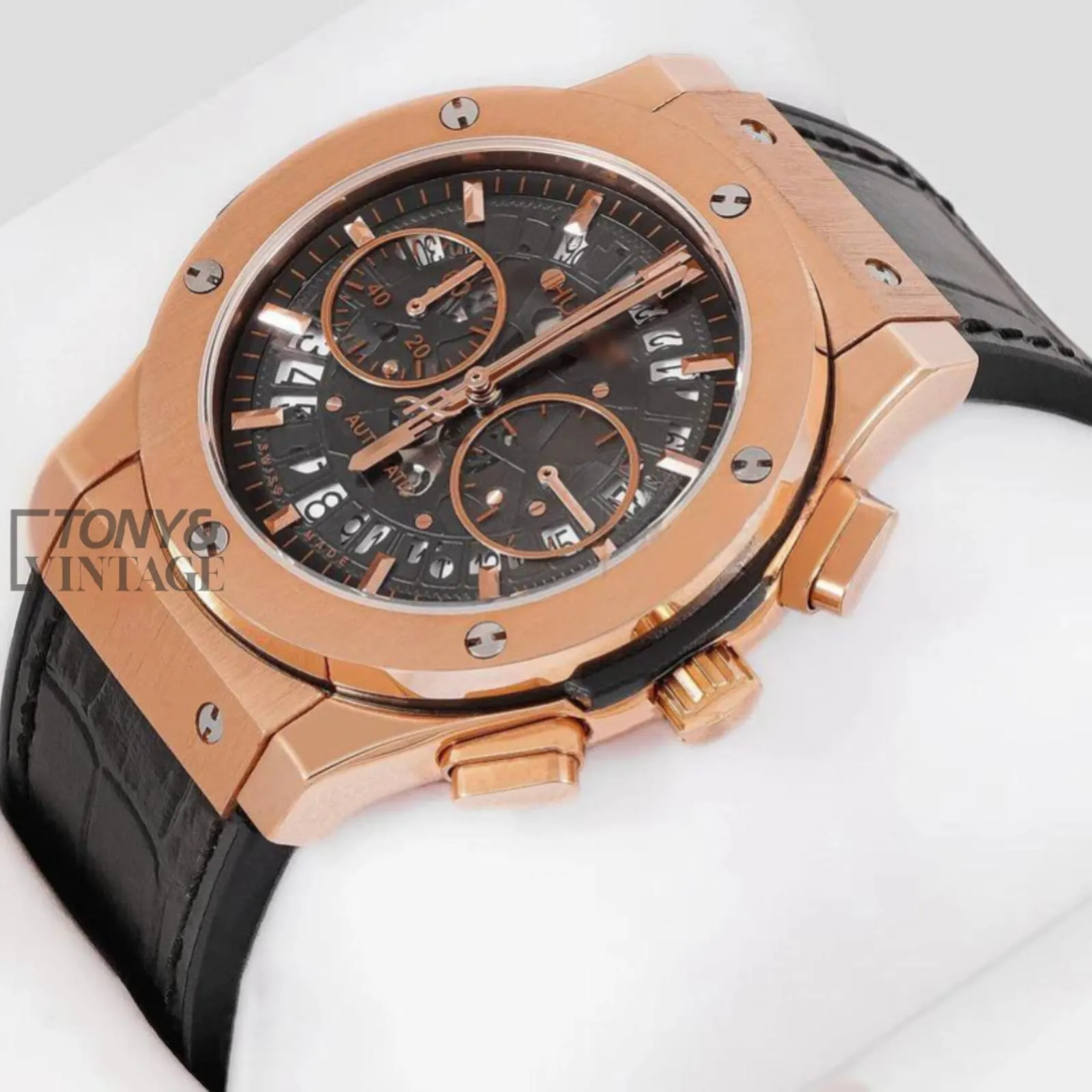 Chronograph Rose Gold Watch With Brown Skeleton Dial & Black Leather Strap