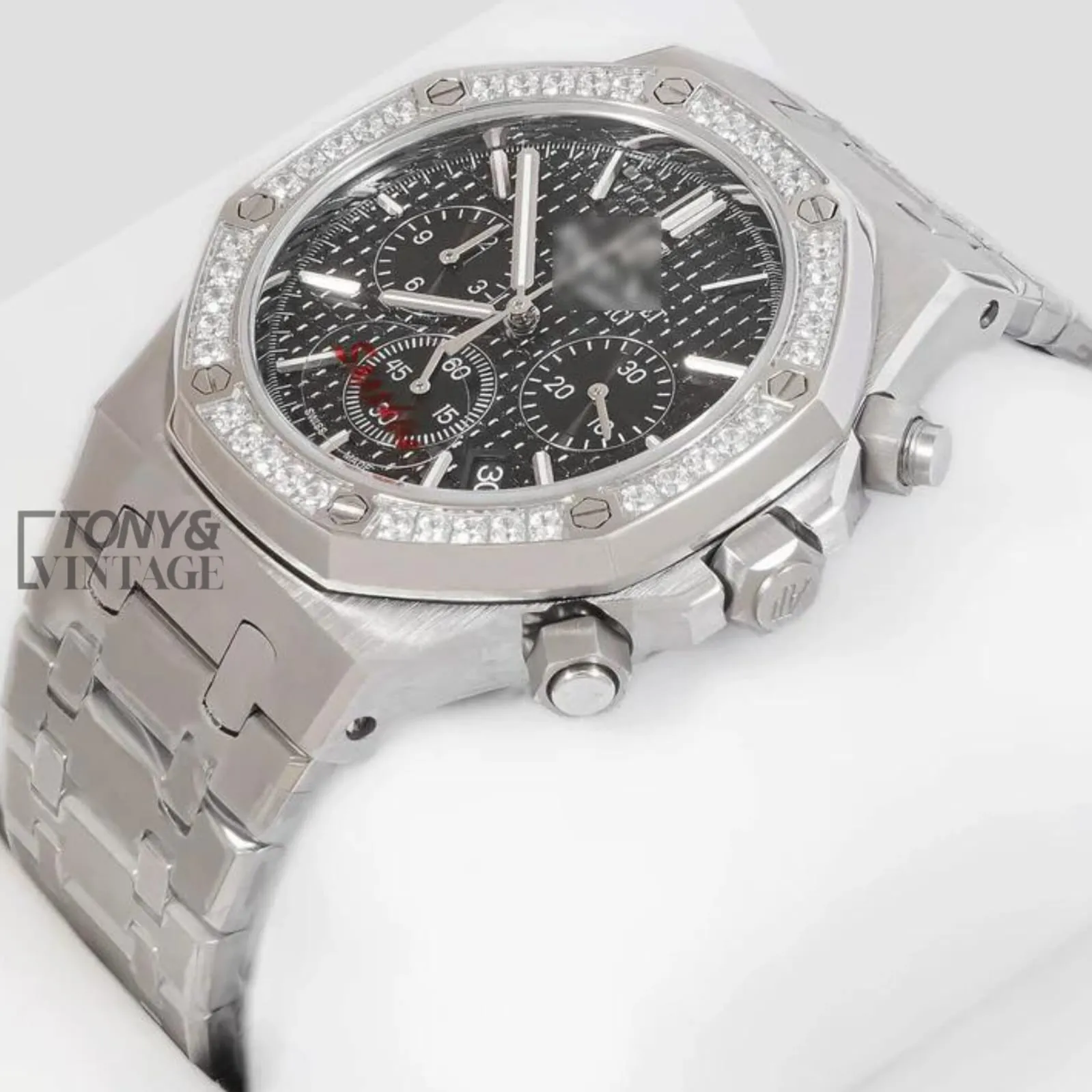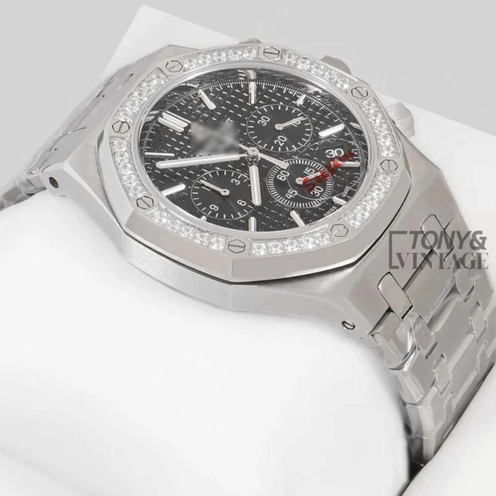 Chronograph Silver Black Dial Stone Bezel