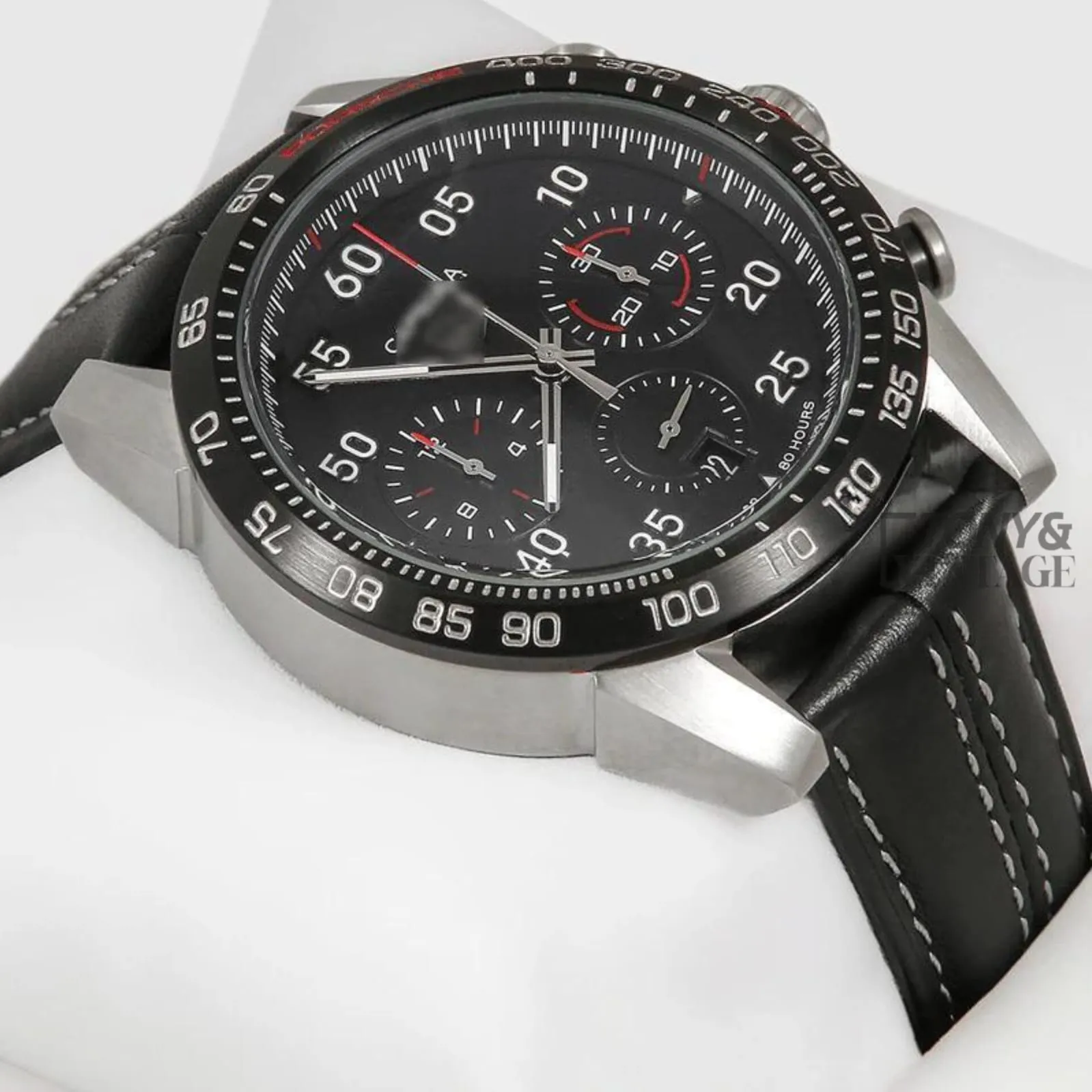 Chronograph Silver Case Watch with Black Dial, Bezel & Black Leather Strap