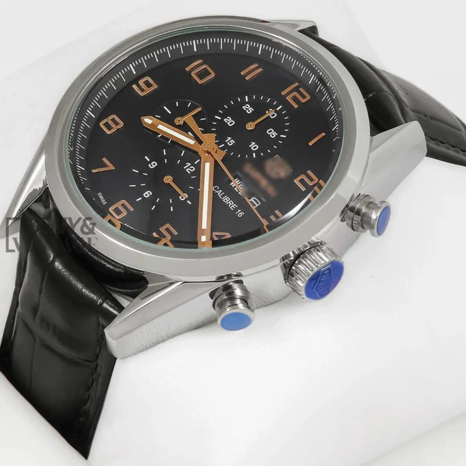“Chronograph Silver Case Watch with Black Dial & Leather Strap “