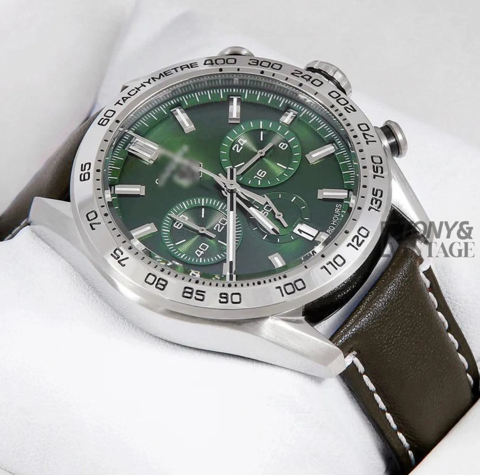 Chronograph Silver Case Watch with Deep Green Dial and Leather Strap