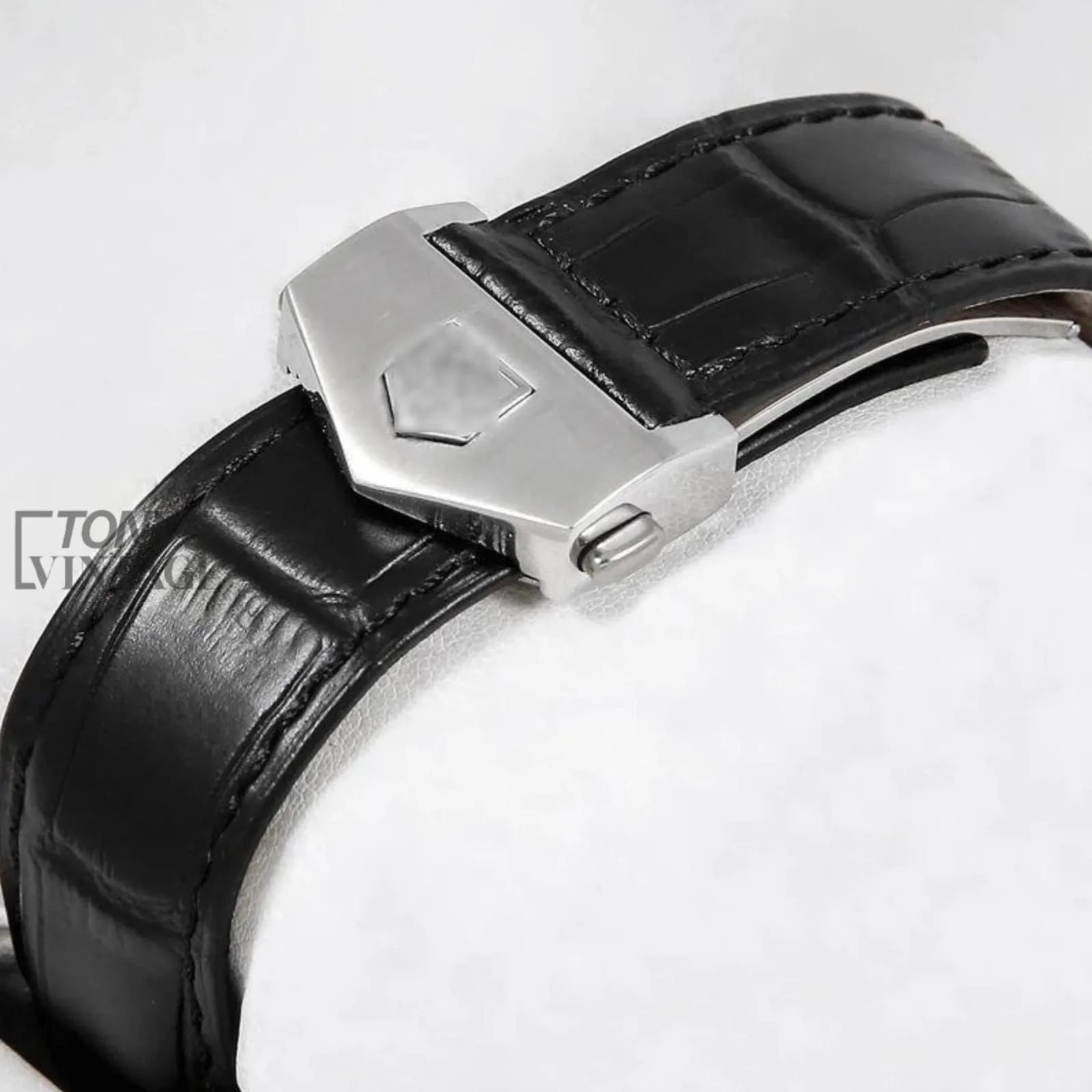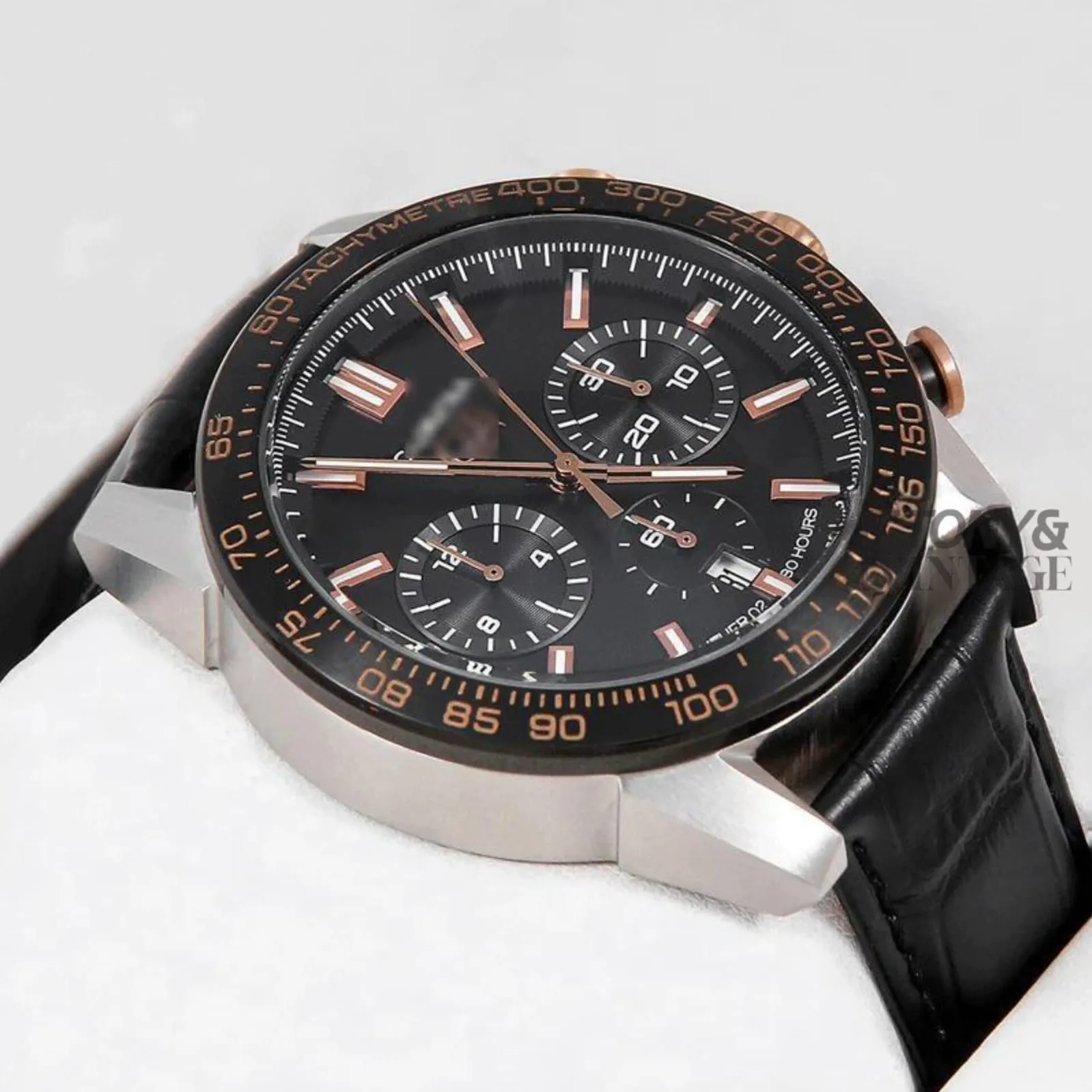 “Chronograph Silver Case with Black Dial and Black Leather Strap Watch “