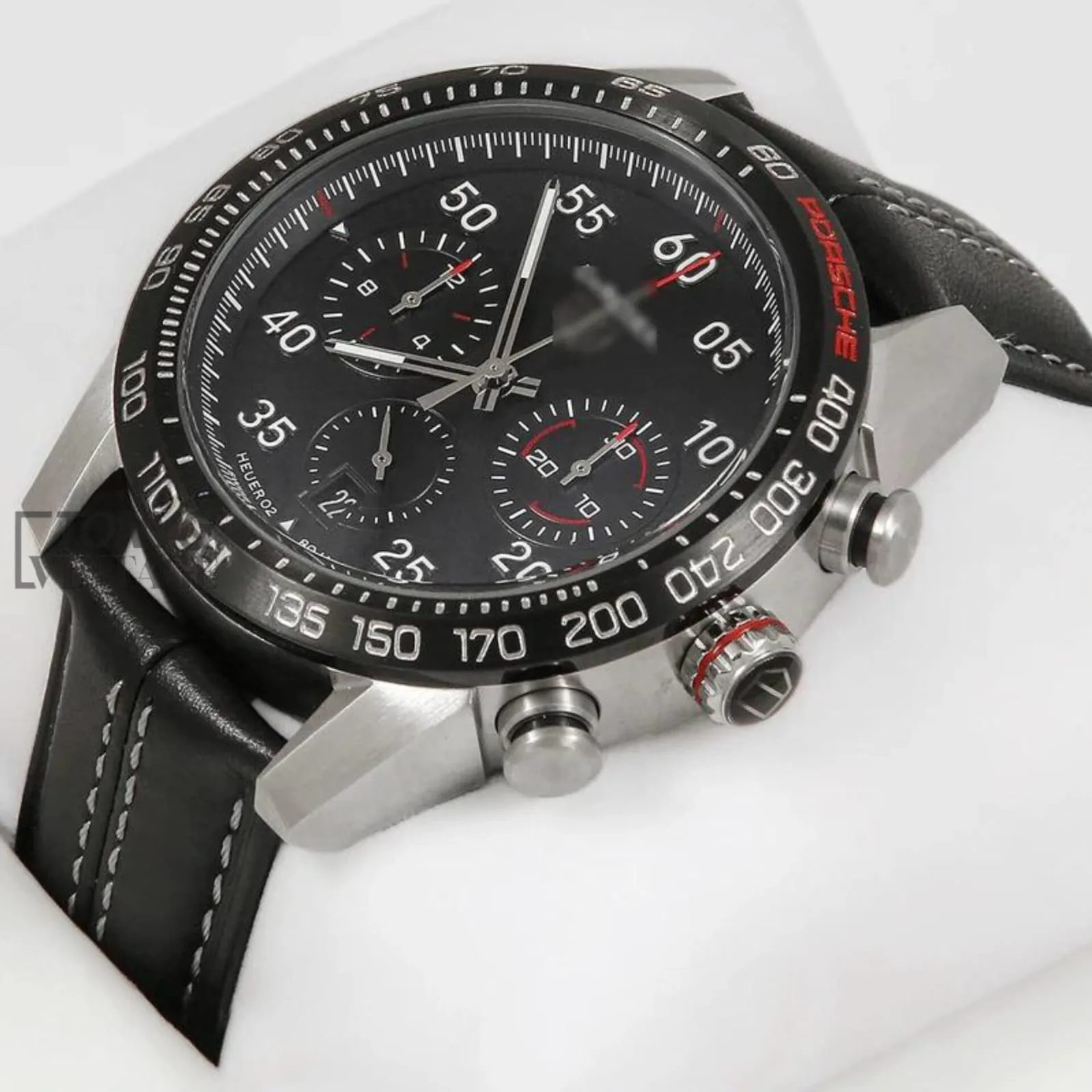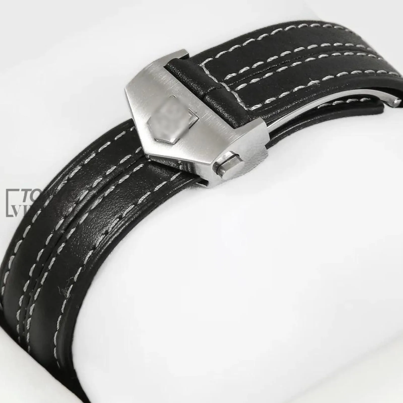 Chronograph Silver Case with Black Dial, Bezel, and Leather Strap Watch