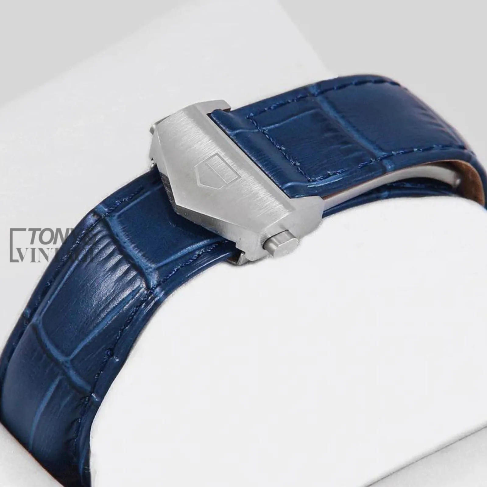 “Chronograph Silver Case with Blue Dial and Leather Strap Watch “