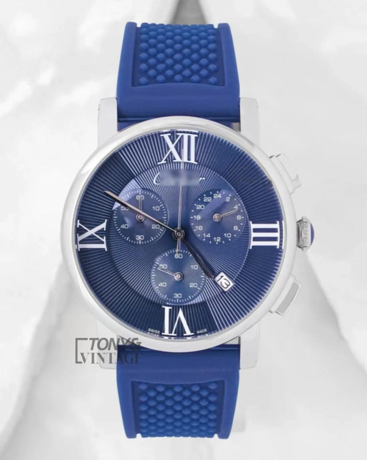Chronograph Silver Watch With Blue Dial and PVC Strap
