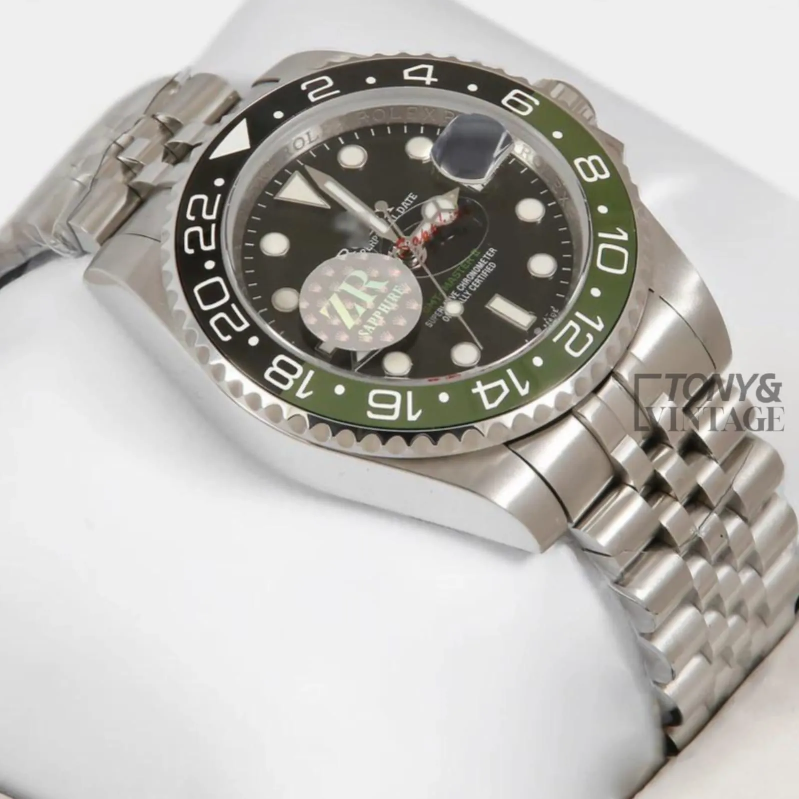 "GMT 40 Silver Black Dial Green Bezel "“GMT 40 Silver Black Dial Green Bezel “