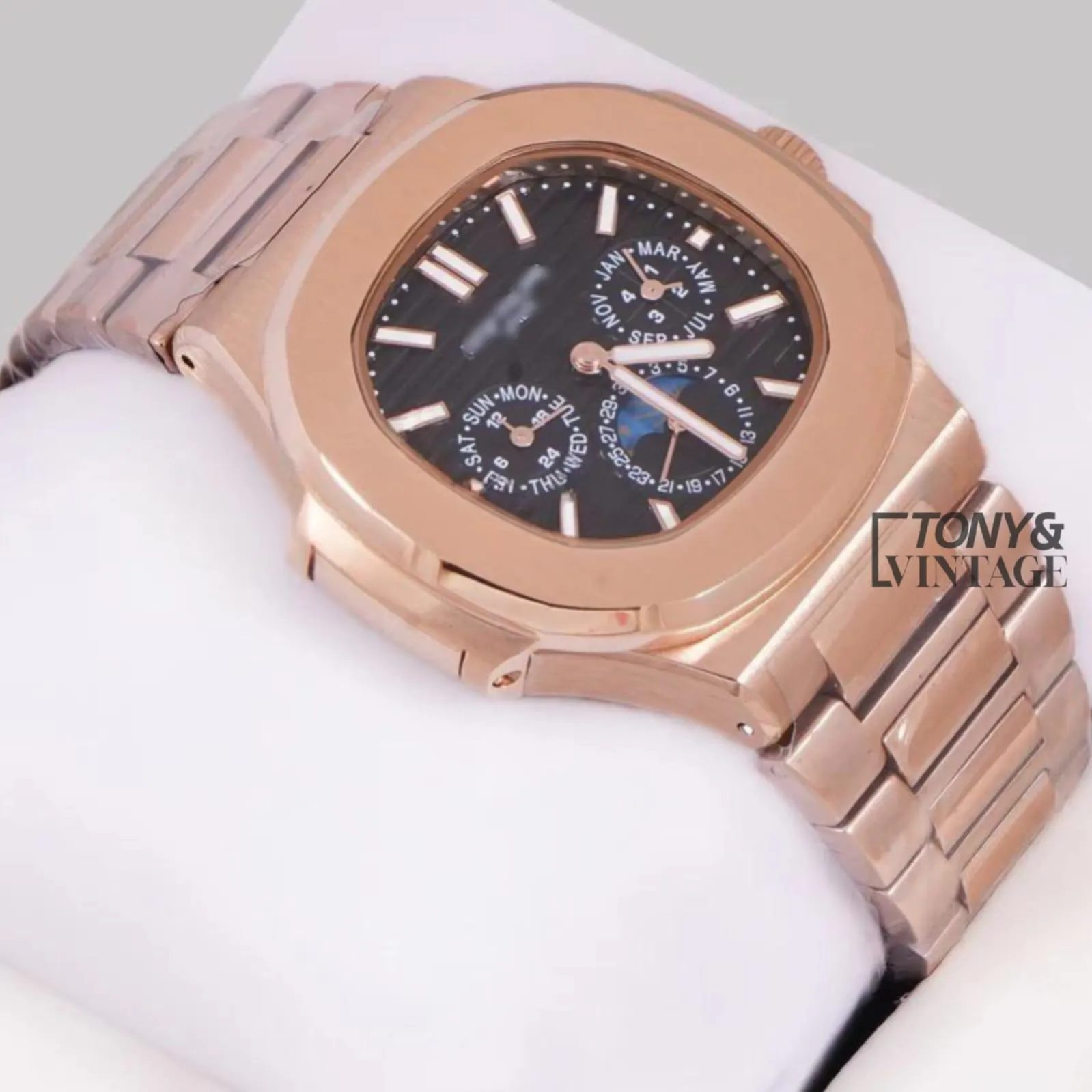 Be the first to review “Moon Phase Chronograph Rose Gold Automatic Watch with Black Dial” Cancel reply