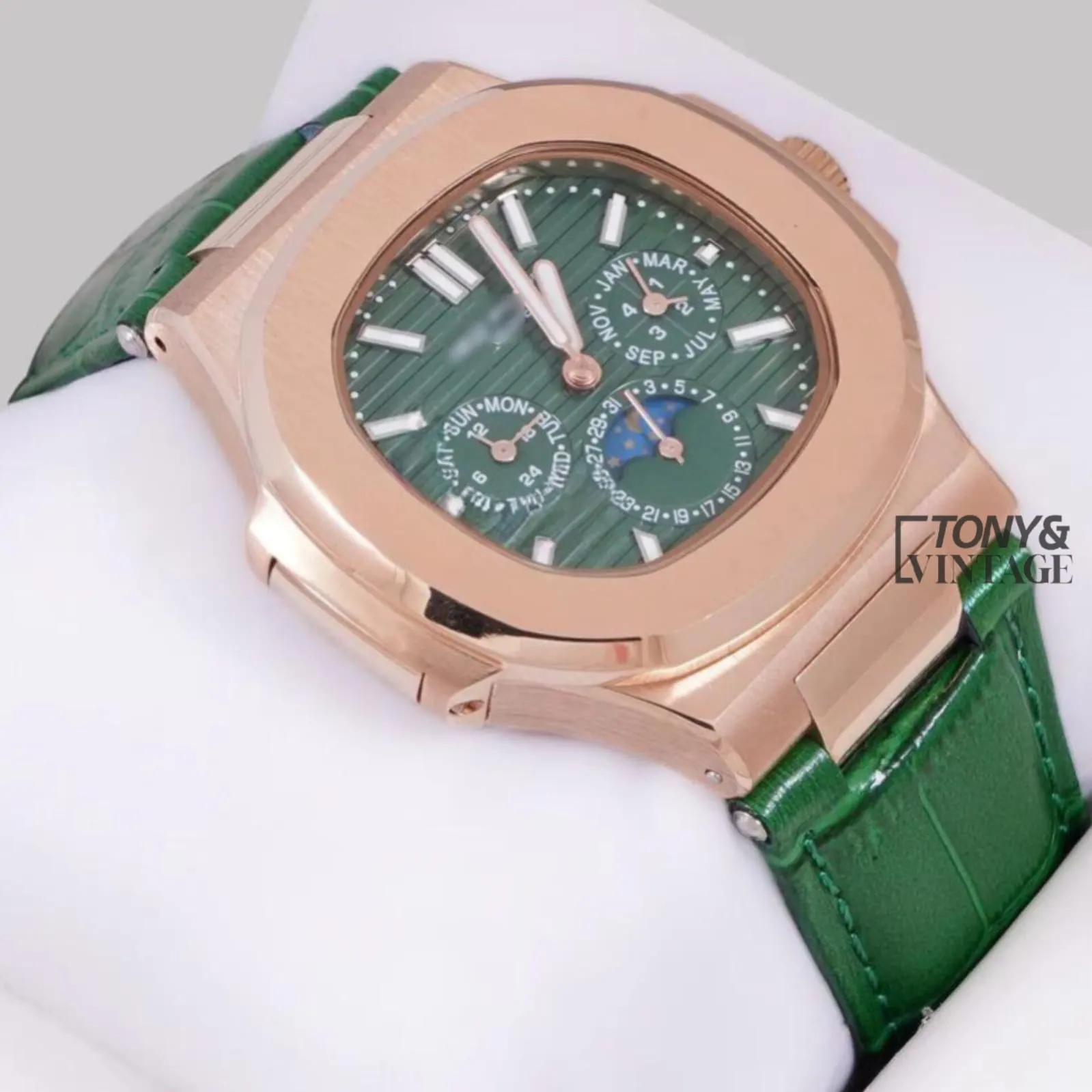 Moon Phase Chronograph Rose Gold Watch with Green Dial and Strap