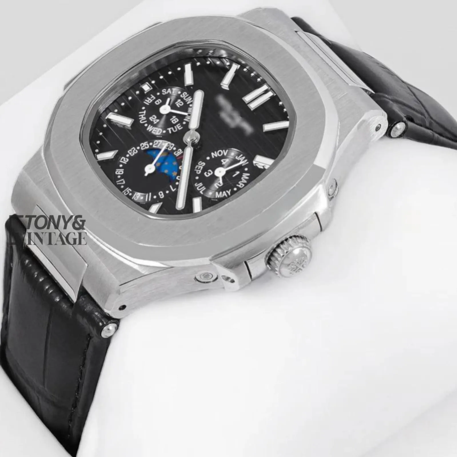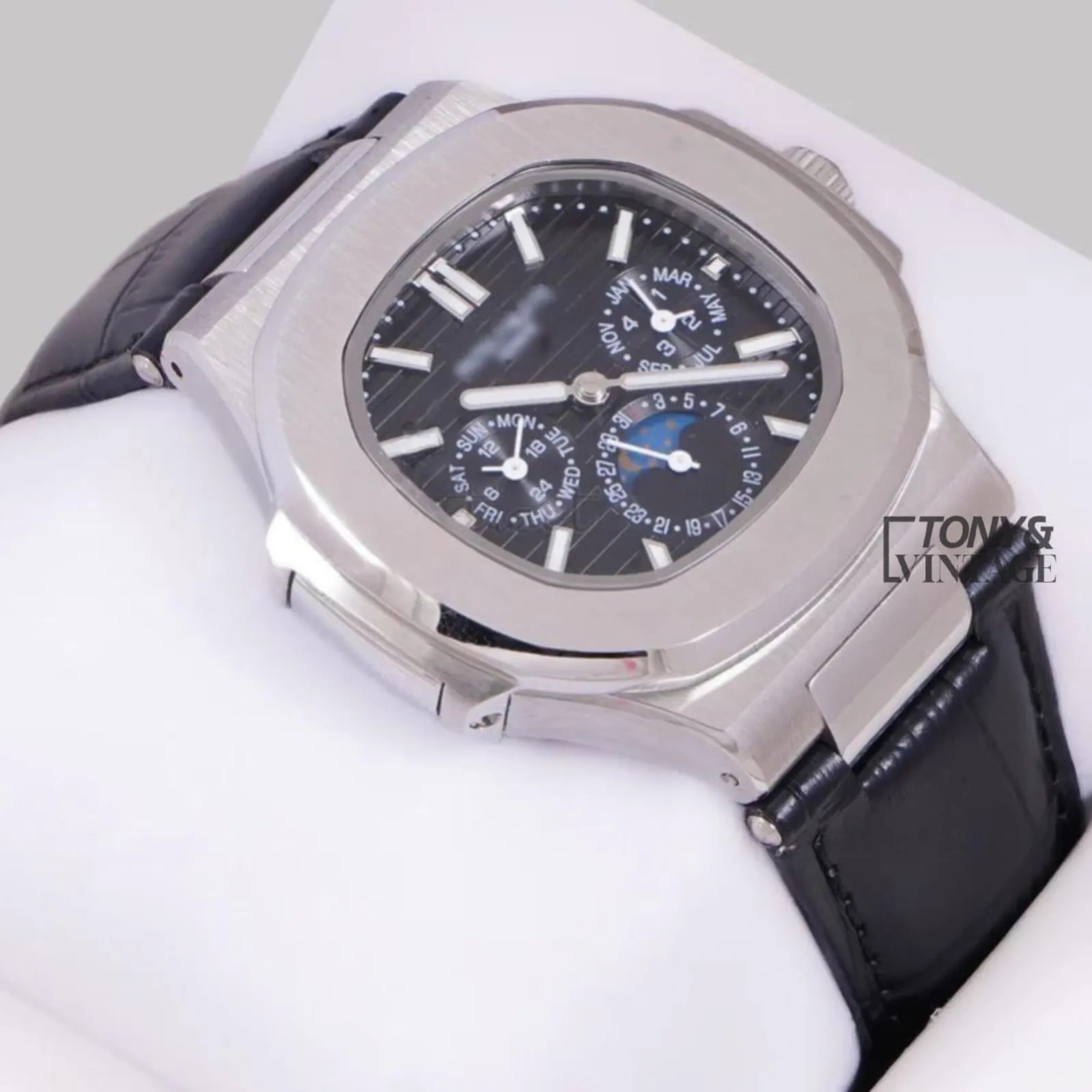 Moon Phase Chronograph Silver Watch with Black Dial and Strap