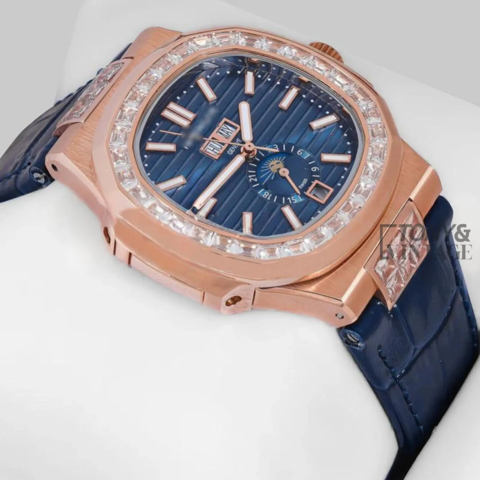 Moon Phase Rose Gold Watch with Stone Bezel, Blue Dial, and Leather Strap