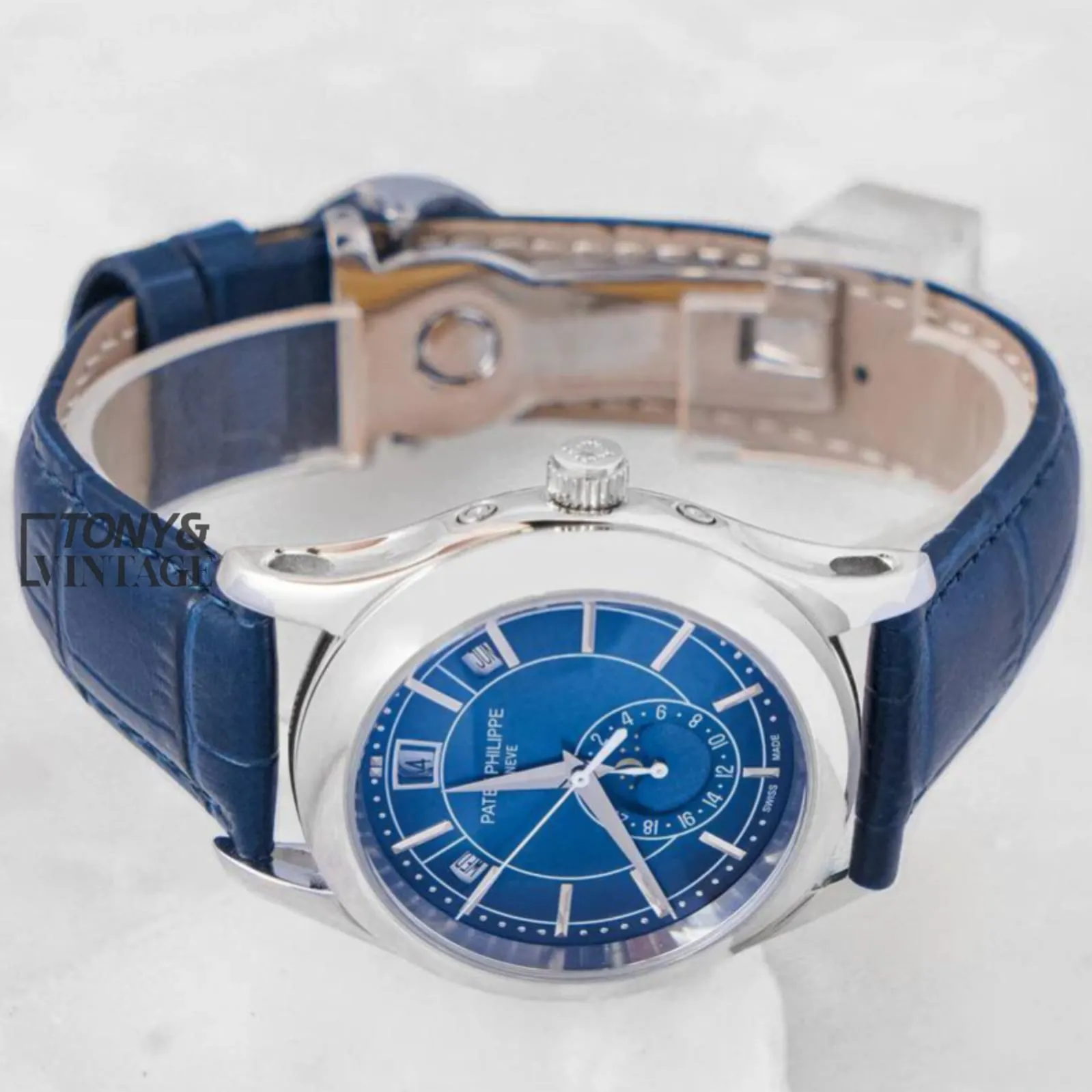 Moon Phase Silver Watch with Blue Dial and Leather StrapMoon Phase Silver Watch with Blue Dial and Leather Strap