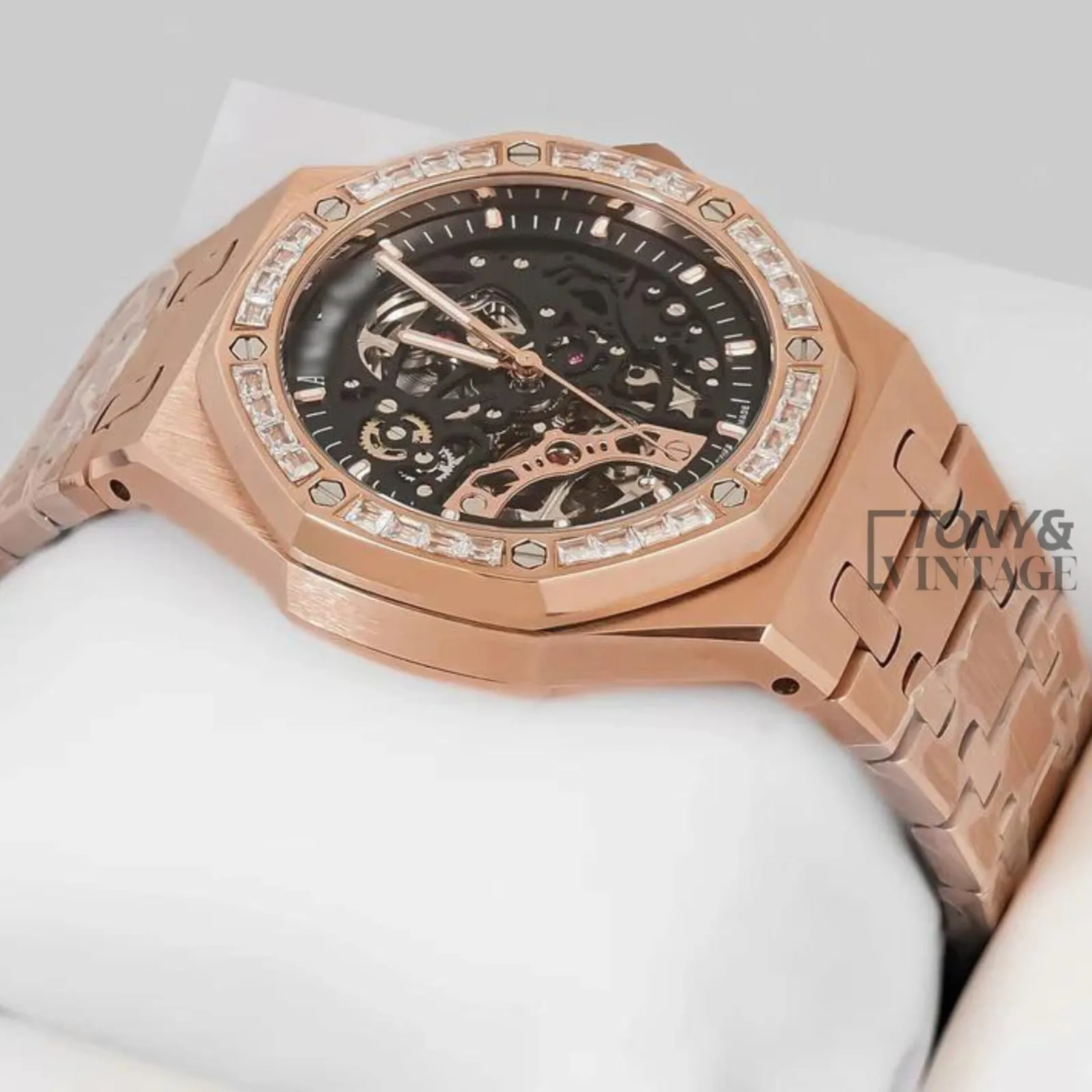 Be the first to review “Rose Gold Black Skeleton Dial Stone Bezel” Cancel reply