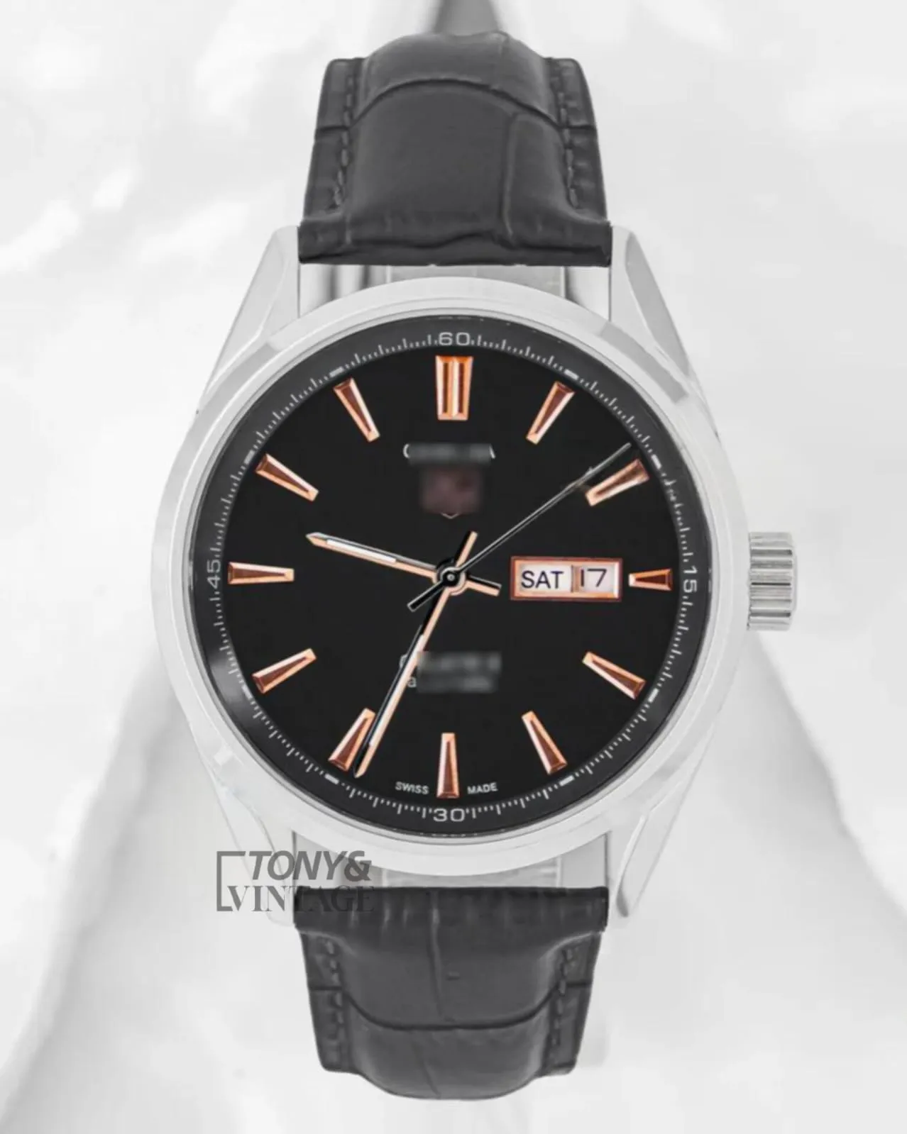 Silver Automatic Watch with Black Dial and Leather Strap