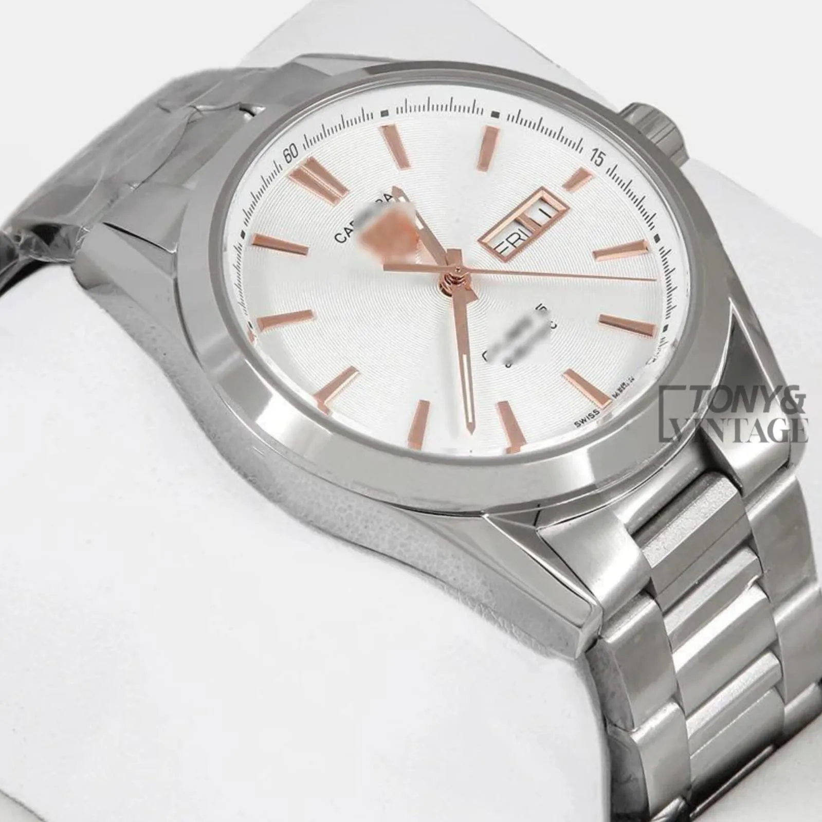 “Silver Automatic Watch with White Dial and Rose Gold Index .”