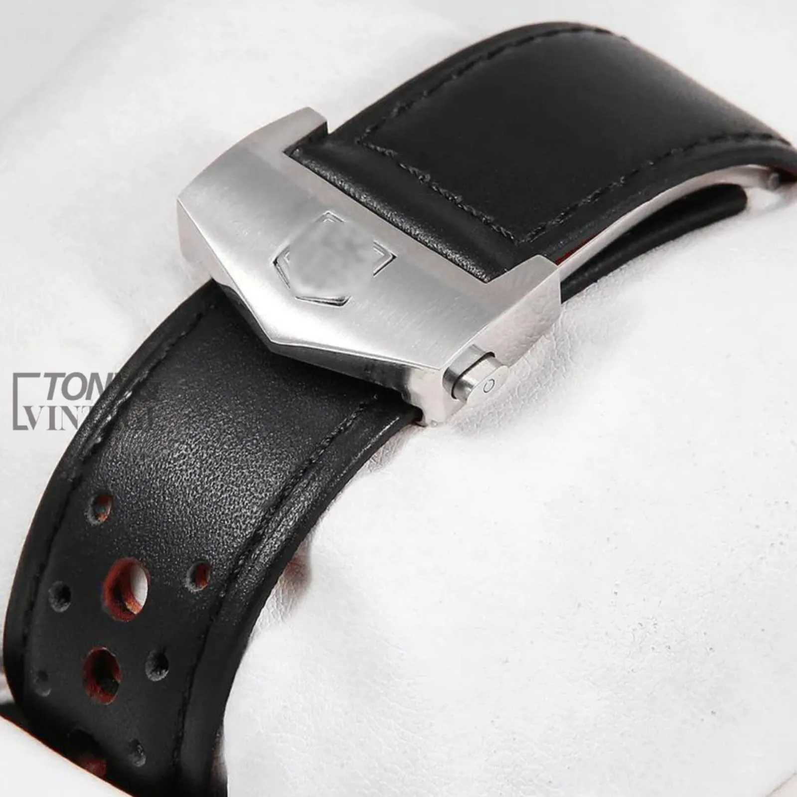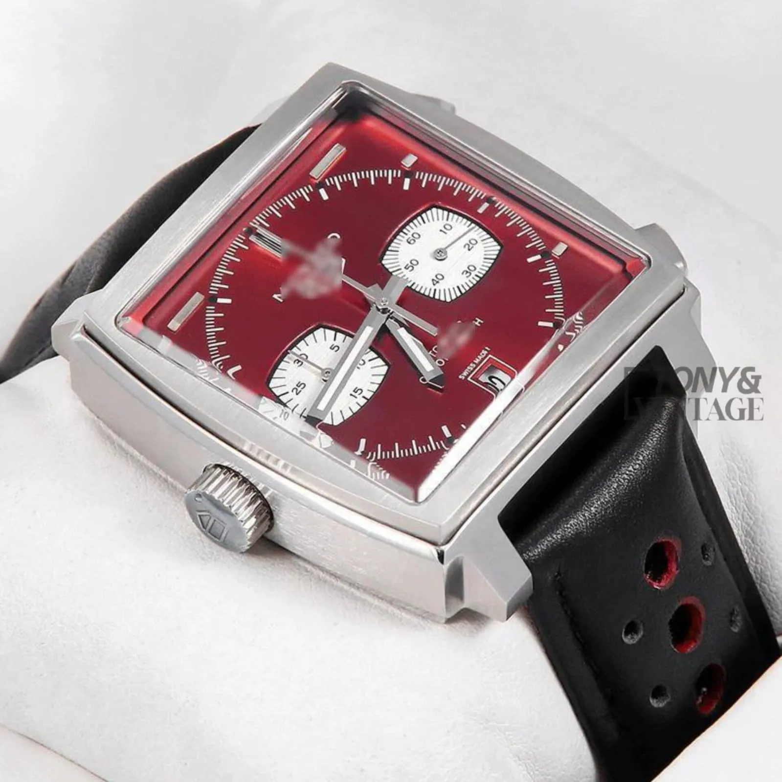 “Silver Case with Red Dial & Black Leather Strap Watch “