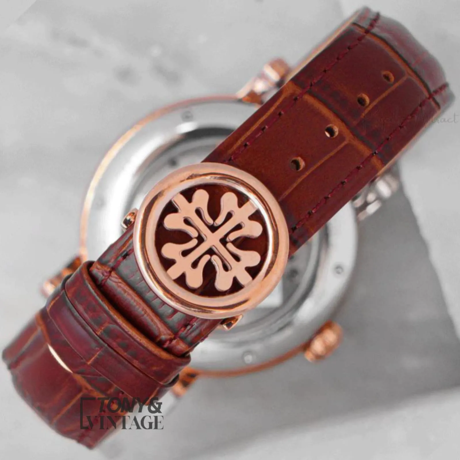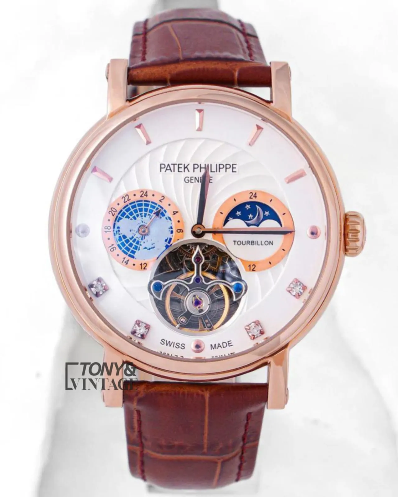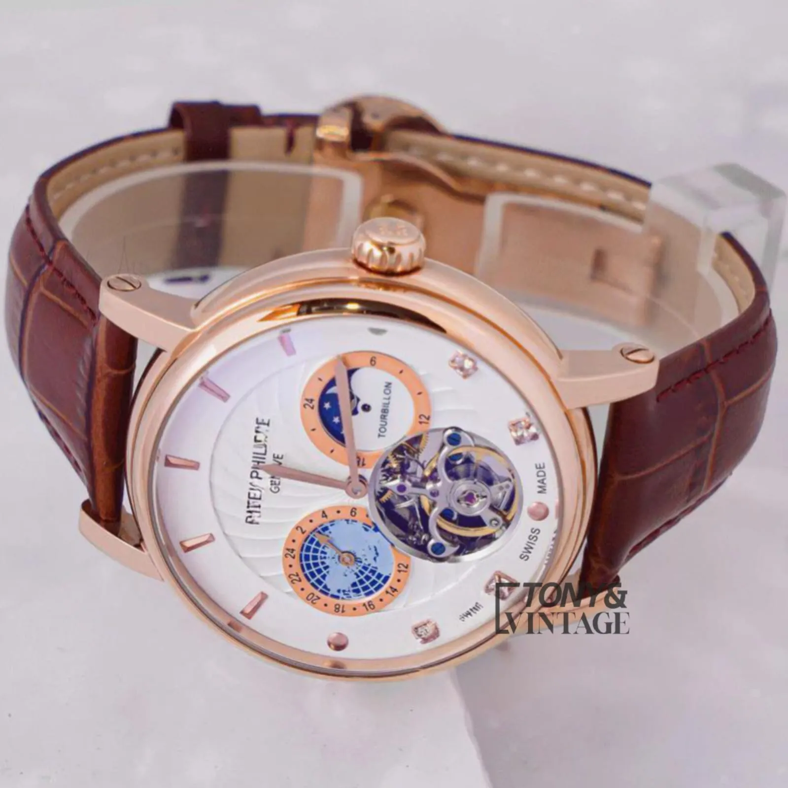 Tourbillon Moon Phase Rose Gold Case White Dial Leather Strap