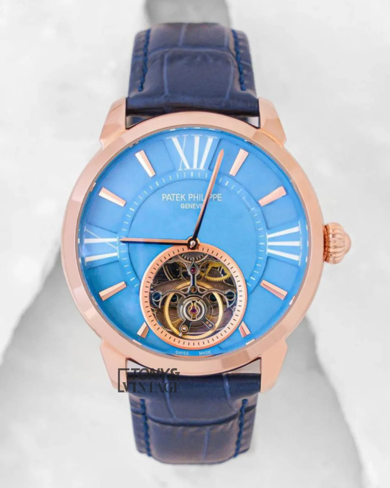 Tourbillon Rose Gold Watch with Sky Blue Dial and Leather StrapTourbillon Rose Gold Watch with Sky Blue Dial and Leather Strap