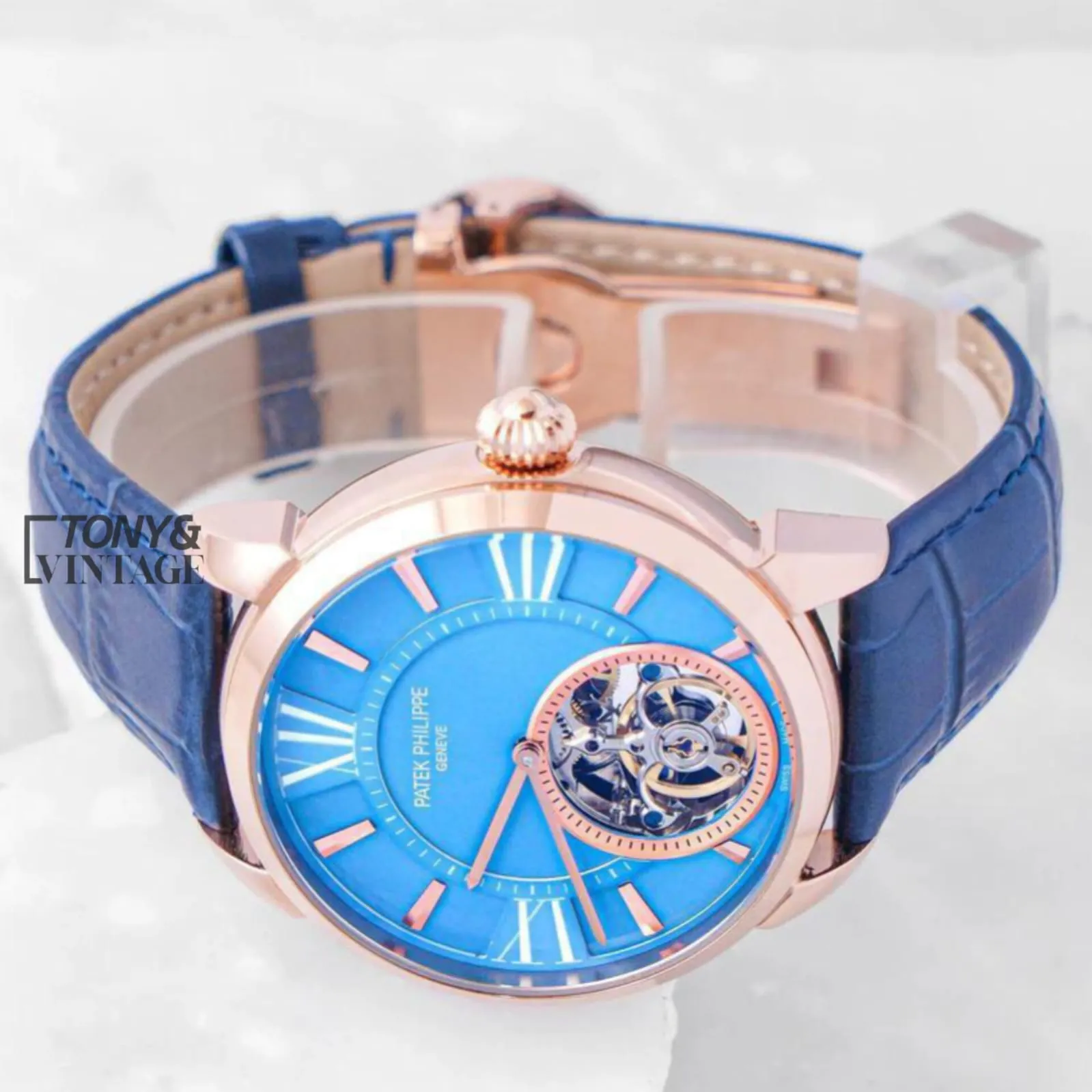 Be the first to review “Tourbillon Rose Gold Watch with Sky Blue Dial and Leather Strap”