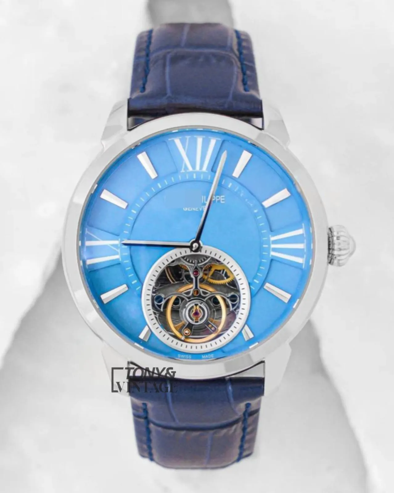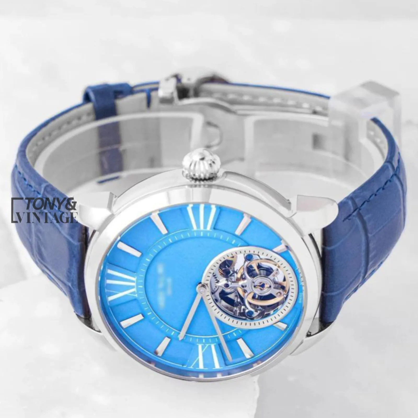 Tourbillon Silver Case With Sky Blue Dial & Leather Strap