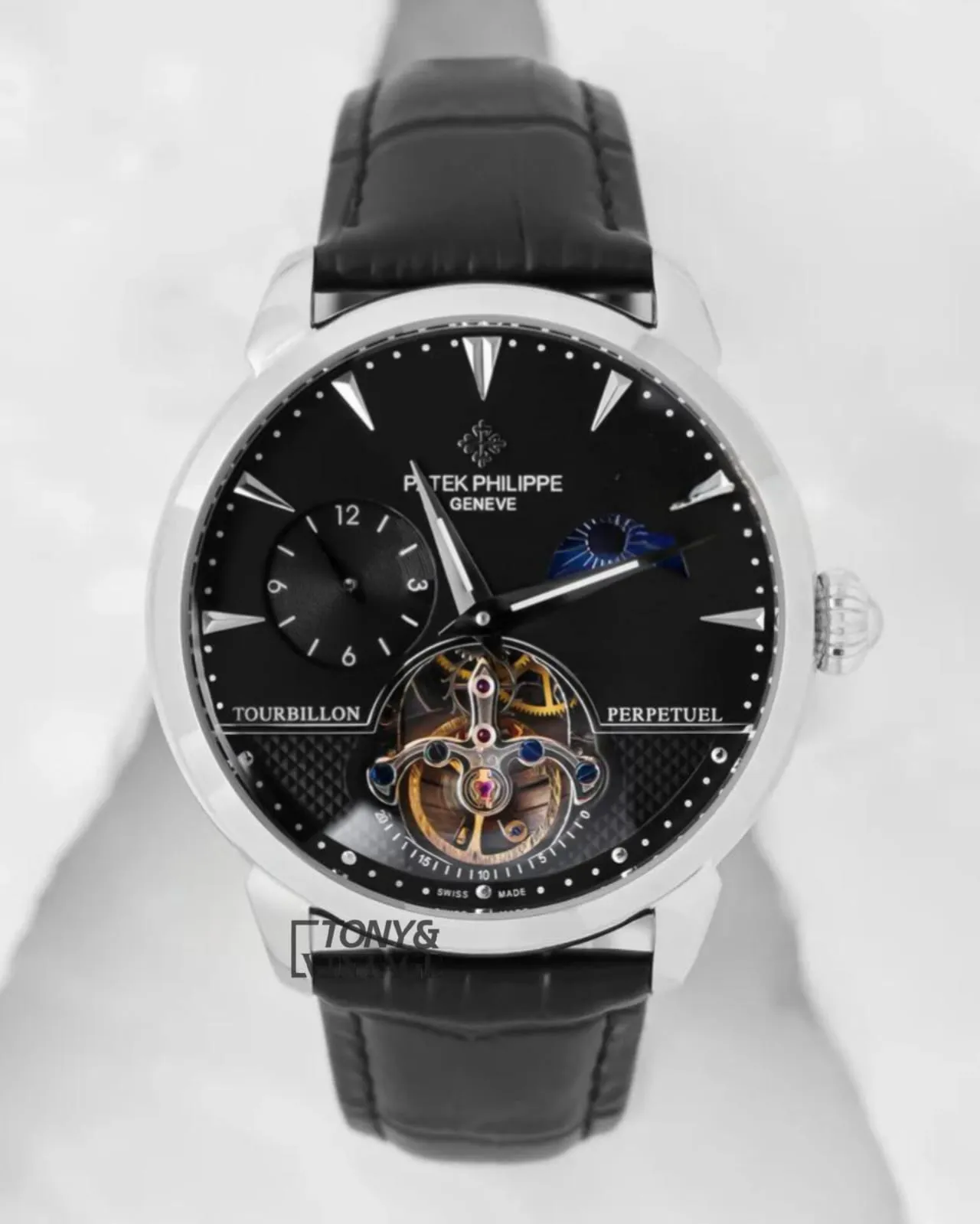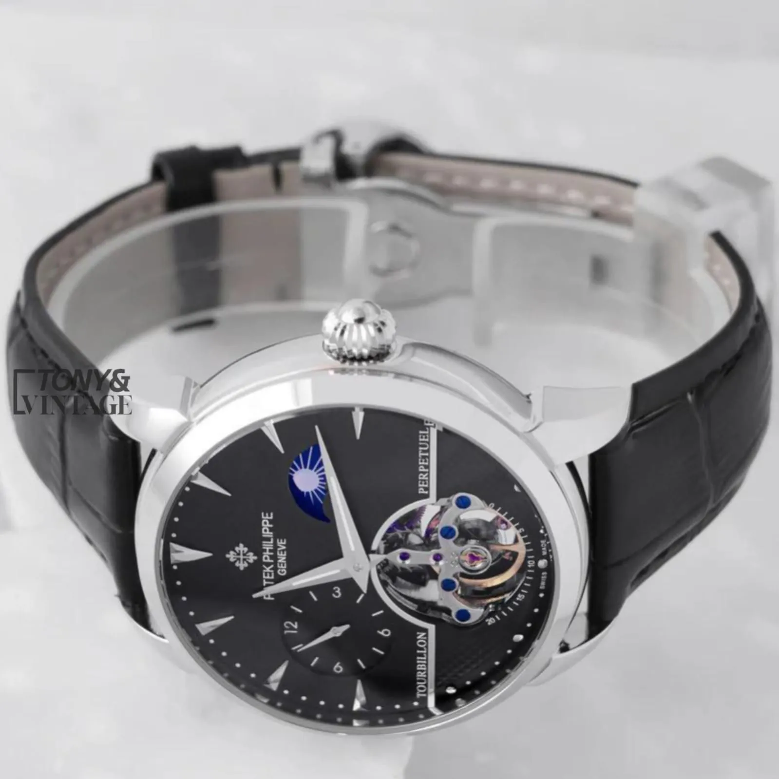 Tourbillon Silver Watch with Black Dial and Leather Strap