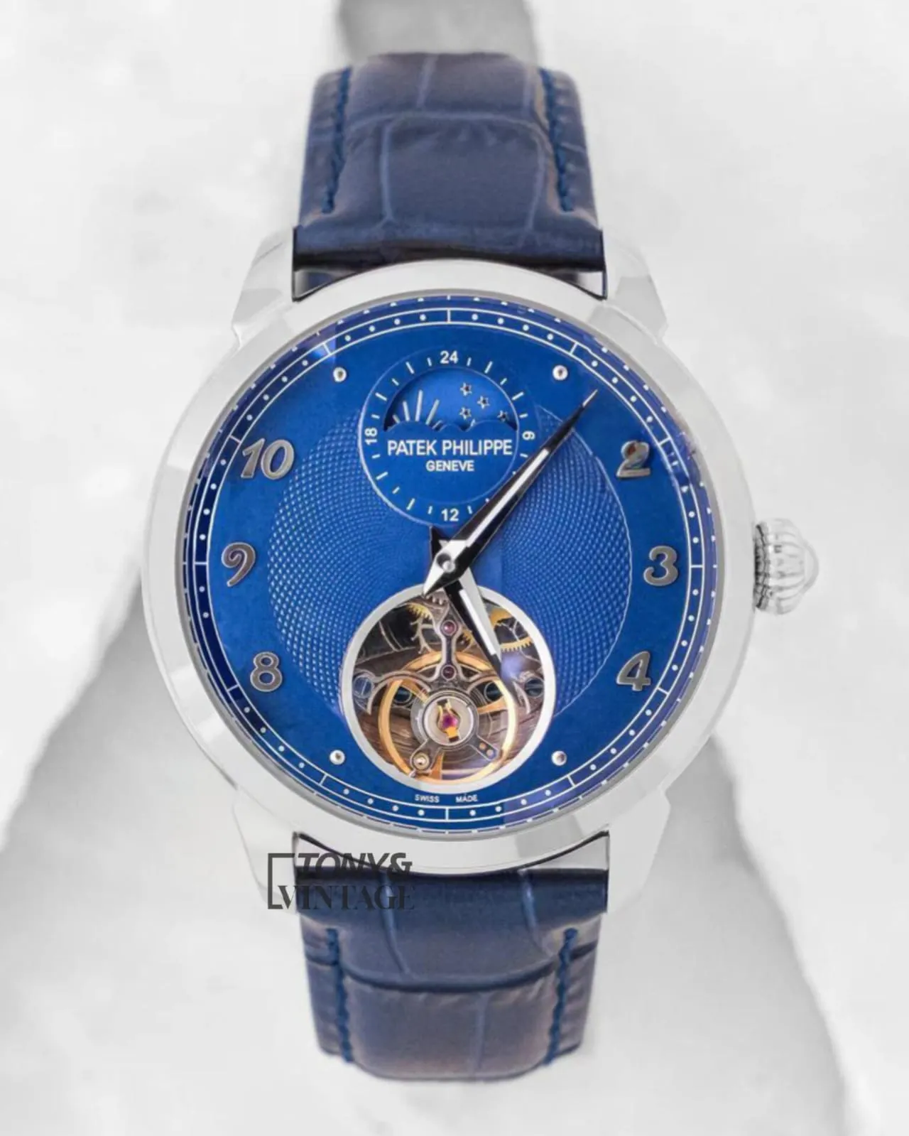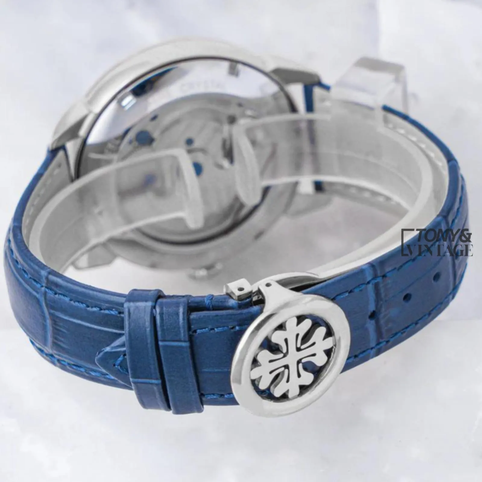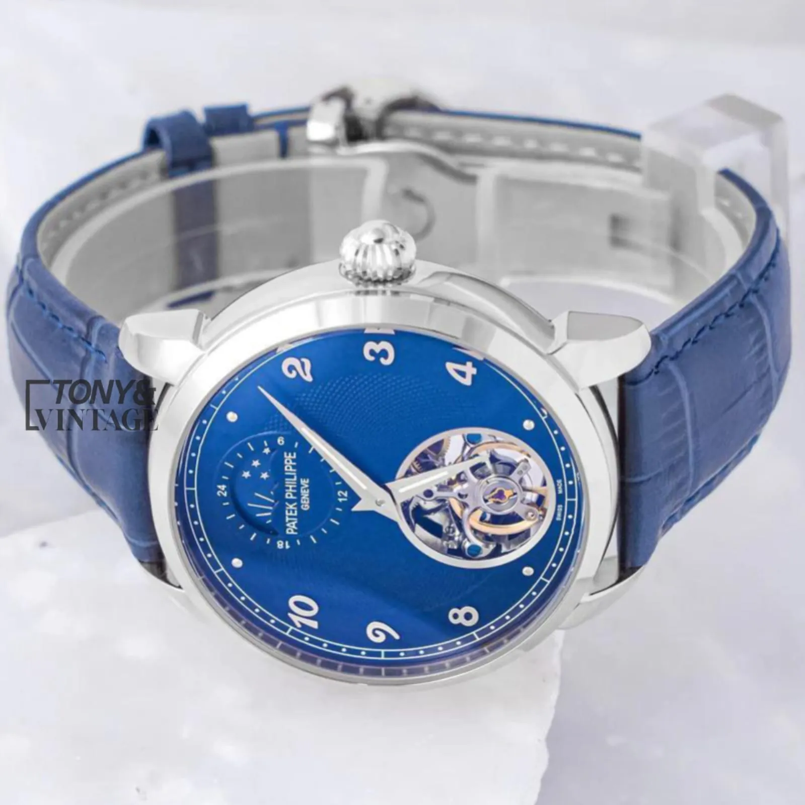 Tourbillon Silver Watch with Blue Dial and Leather Strap
