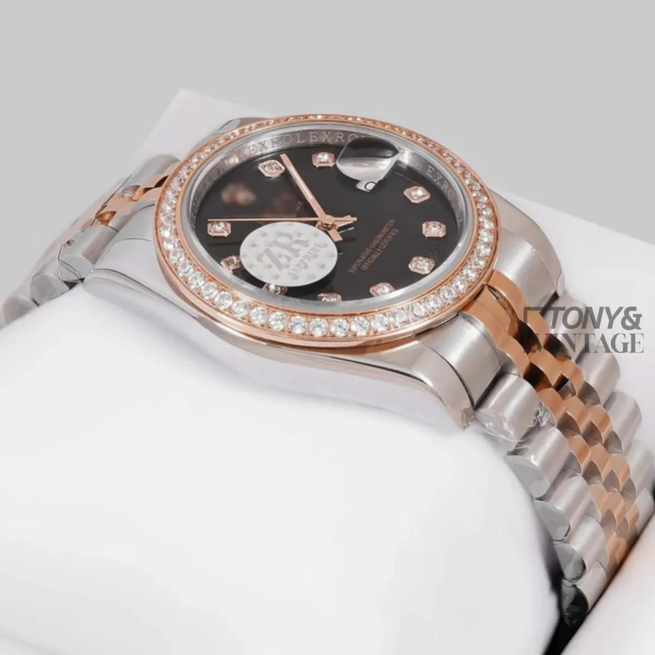 “Two Tone Rose Gold Black Dial Stone Bezel & Figure Automatic Watch “