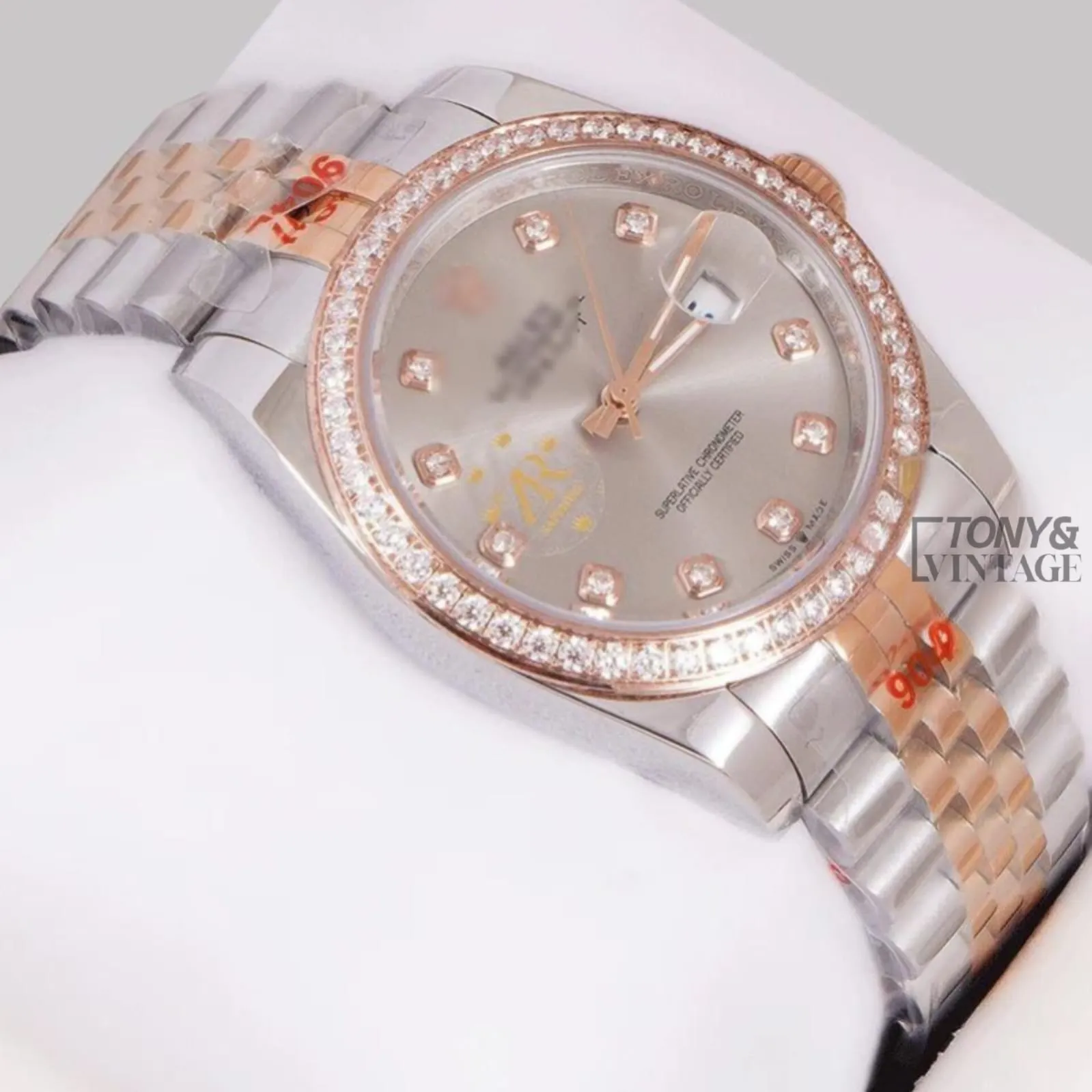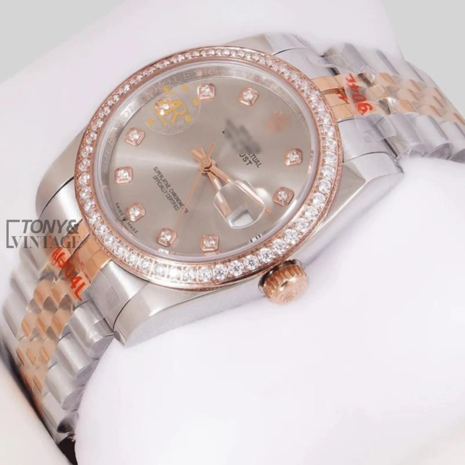 Be the first to review “Two Tone Rose Gold Gray Dial Stone Bezel Automatic Watch” Cancel reply