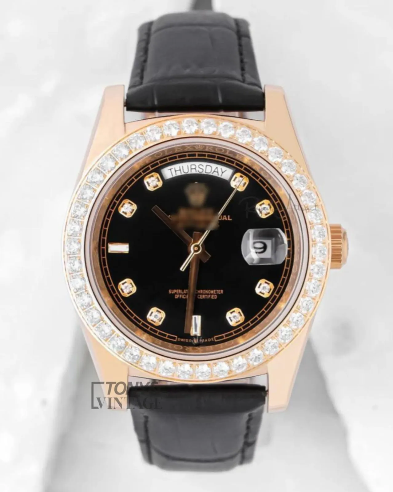 “Yellow Gold Automatic Watch with Black Dial and Leather Strap “