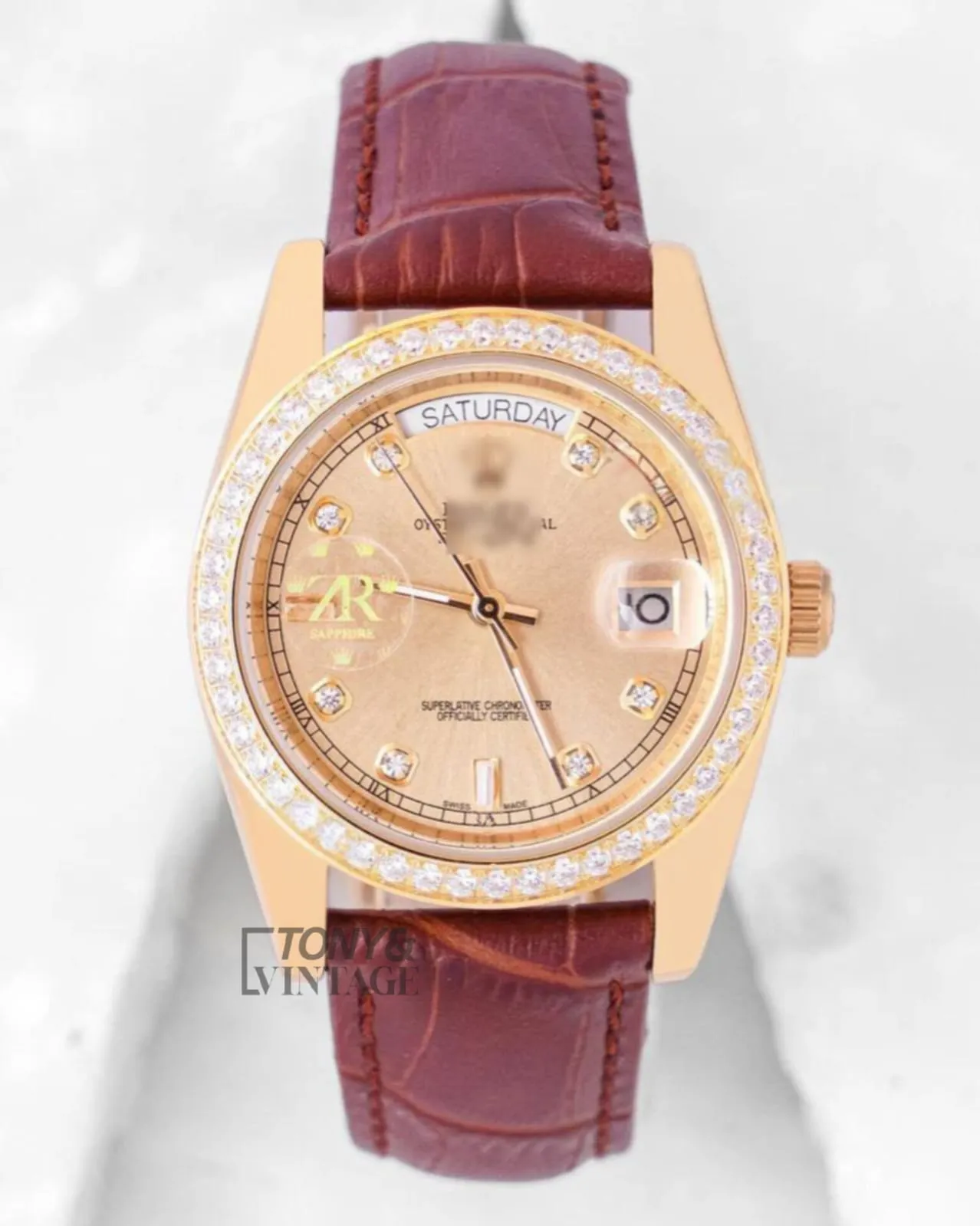 “Yellow Gold Case with Dial and Brown Leather Strap Automatic Watch “