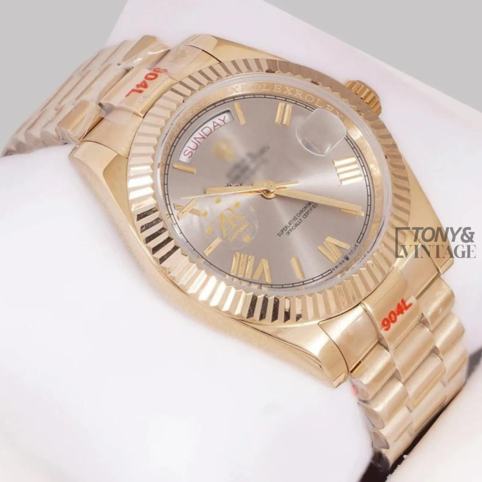 Yellow Gold Gray Dial Fluted Bezel & Roman Figure Automatic Watch